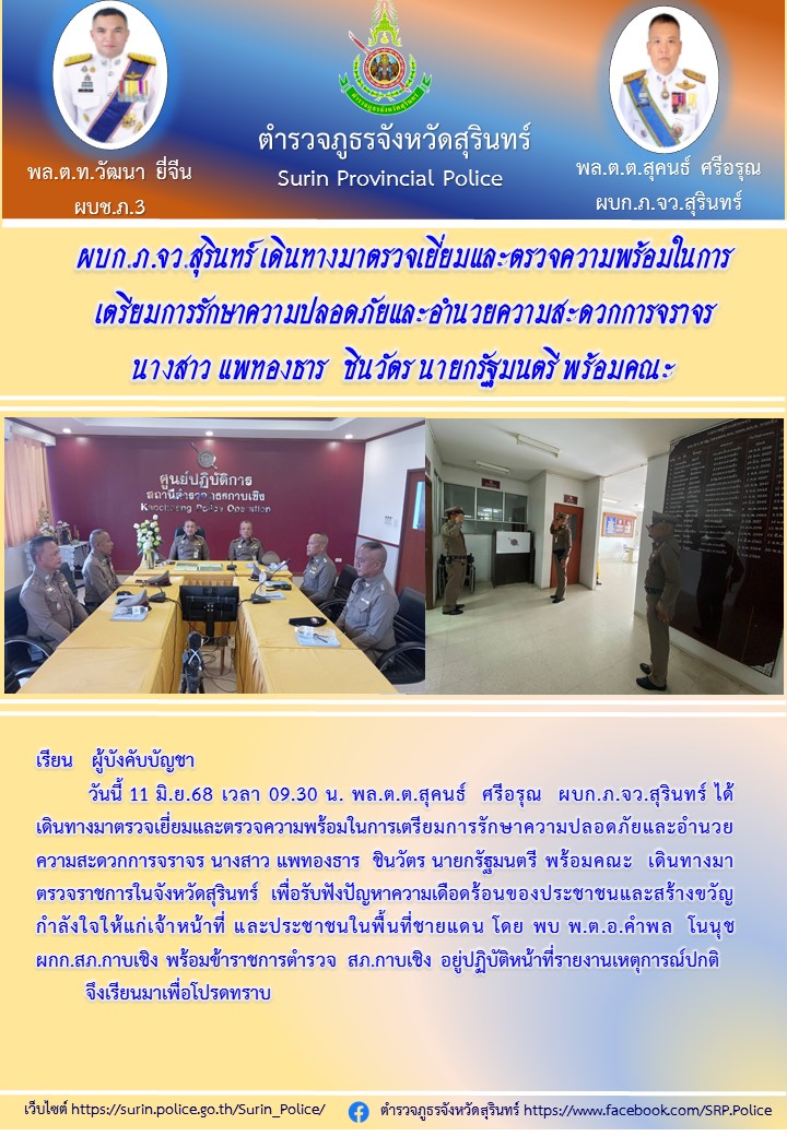 11 มิ.ย. 2568 12:31:37 วันนี้ 11 มิ.ย.68 เวลา 09.30 น. พล.ต.ต. สุคนธ์ ศรีอรุณ ผบก.ภ.จว.สุรินทร์ ได้เดินทางมาตรวจเยี่ยมและตรวจความพร้อมในการเตรียมการรักษาความปลอดภัยและอำนวยความสะดวกการจราจร นางสาวแพทองธาร ชินวัตร นายกรัฐมนตรี พร้อมคณะ ซึ่งเดินทางมาตรวจราชการในจังหวัดสุรินทร์ เพื่อรับฟังปัญหาความเดือดร้อนของ...