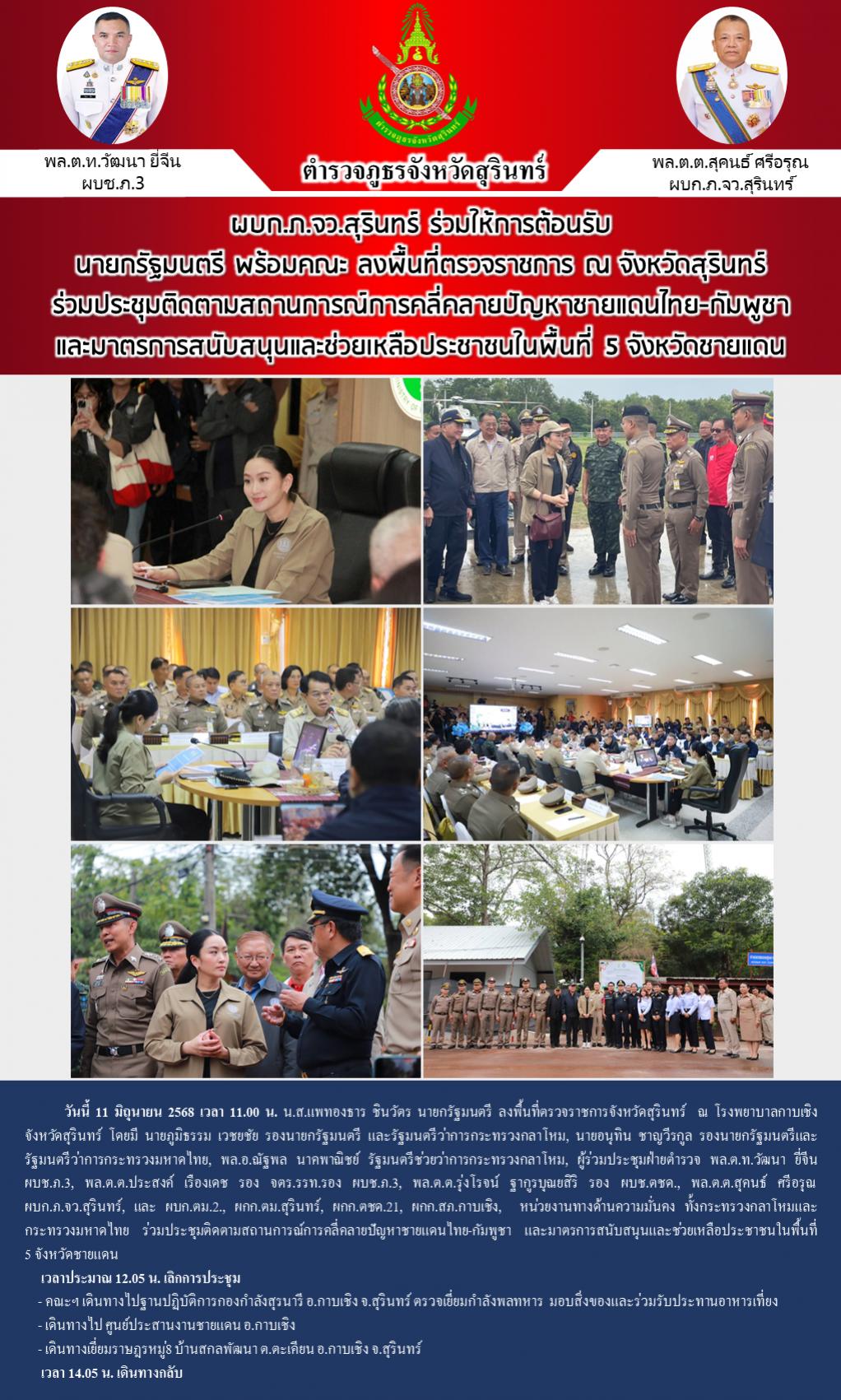 11 มิ.ย. 2568 19:51:41ผบก.ภ.จว.สุรินทร์ ร่วมให้การต้อนรับ นายกรัฐมนตรี พร้อมคณะ ลงพื้นที่ตรวจราชการ ณ จังหวัดสุรินทร์ ร่วมประชุมติดตามสถานการณ์การคลี่คลายปัญหาชายแดนไทย-กัมพูชา และมาตรการสนับสนุนและช่วยเหลือประชาชนในพื้นที่ 5 จังหวัดชายแดน วันนี้ 11 มิถุนายน 2568 เวลา 11.00 น. น.ส.แพทองธาร ชินวัตร นายกรัฐมน...