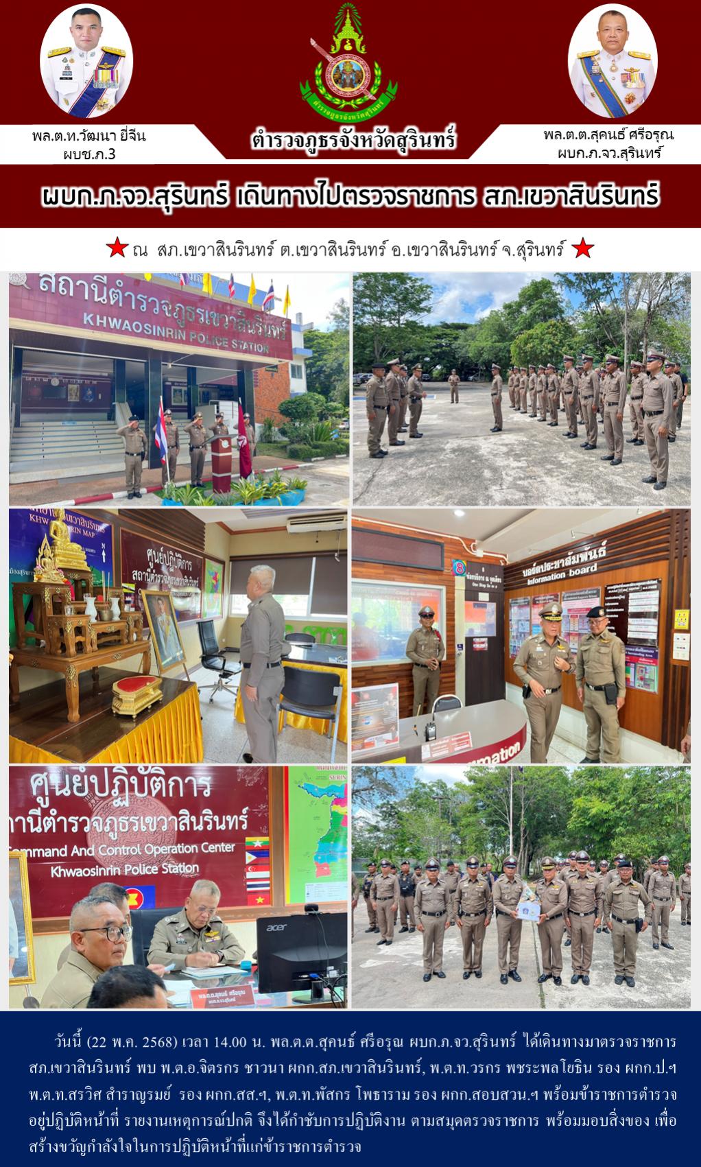 22 พ.ค. 2568 18:38:38ผบก.ภ.จว.สุรินทร์ เดินทางไปตรวจราชการ สภ.เขวาสินรินทร์ วันนี้ (22 พ.ค. 2568) เวลา 14.00 น. พล.ต.ต.สุคนธ์ ศรีอรุณ ผบก.ภ.จว.สุรินทร์ ได้เดินทางมาตรวจราชการ สภ.เขวาสินรินทร์ พบ พ.ต.อ.จิตรกร ชาวนา ผกก.สภ.เขวาสินรินทร์, พ.ต.ท.วรกร พชระพลโยธิน รอง ผกก.ป.ฯ พ.ต.ท.สรวิศ สำราญรมย์ รอง ผกก.สส.ฯ, พ.ต.ท...