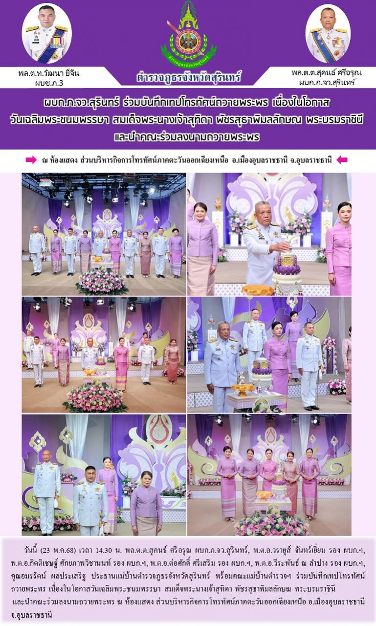 23 พ.ค. 2568 18:47:09ผบก.ภ.จว.สุรินทร์ ร่วมบันทึกเทปโทรทัศน์ถวายพระพร เนื่องในโอกาสวันเฉลิมพระชนมพรรษา สมเด็จพระนางเจ้าสุทิดา พัชรสุธาพิมลลักษณ พระบรมราชินี และนำคณะร่วมลงนามถวายพระพร วันนี้ (23 พ.ค.68) เวลา 14.30 น. พล.ต.ต.สุคนธ์ ศรีอรุณ ผบก.ภ.จว.สุรินทร์, พ.ต.อ.วรายุส์ จันทร์เยี่ยม รอง ผบก.ฯ, พ.ต.อ.กิตติเชษฐ์ ศักยภาพ...