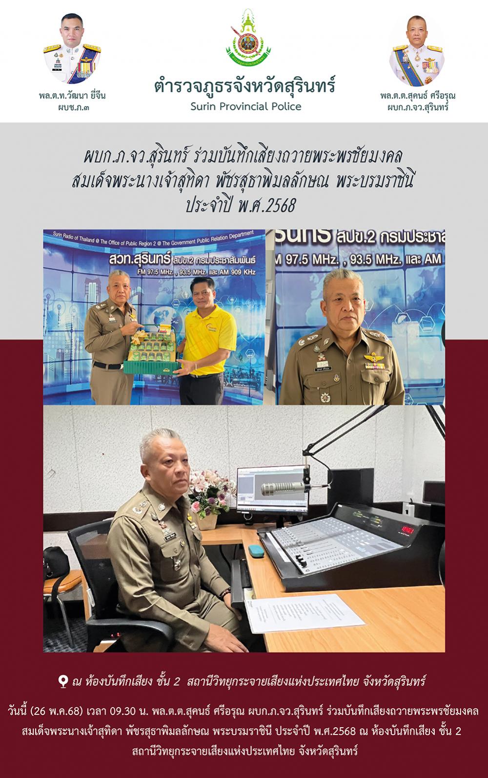 26 พ.ค. 2568 10:54:09ผบก.ภ.จว.สุรินทร์ ร่วมบันทึกเสียงถวายพระพรชัยมงคล สมเด็จพระนางเจ้าสุทิดา พัชรสุธาพิมลลักษณ พระบรมราชินี ประจำปี พ.ศ.2568 วันนี้ (26 พ.ค.68) เวลา 09.30 น. พล.ต.ต.สุคนธ์ ศรีอรุณ ผบก.ภ.จว.สุรินทร์ ร่วมบันทึกเสียงถวายพระพรชัยมงคล สมเด็จพระนางเจ้าสุทิดา พัชรสุธาพิมลลักษณ พระบรมราชินี ประจำปี พ.ศ.2568 ...