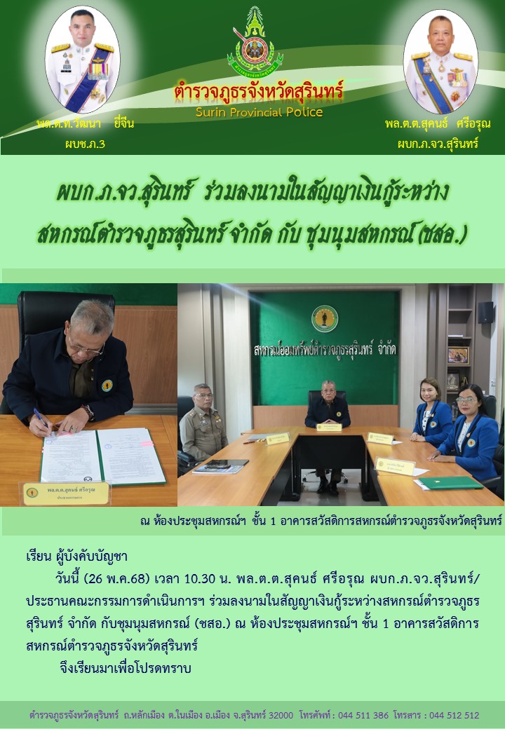 26 พ.ค. 2568 16:40:02 วันนี้ (26 พ.ค.68) เวลา 10.30 น. พล.ต.ต.สุคนธ์ ศรีอรุณ ผบก.ภ.จว.สุรินทร์/ประธานคณะกรรมการดำเนินการฯ ร่วมลงนามในสัญญาเงินกู้ระหว่างสหกรณ์ตำรวจภูธรสุรินทร์ จำกัด กับชุมนุมสหกรณ์ (ชสอ.) ณ ห้องประชุมสหกรณ์ฯ ชั้น 1 อาคารสวัสดิการสหกรณ์ตำรวจภูธรจังหวัดสุรินทร์...