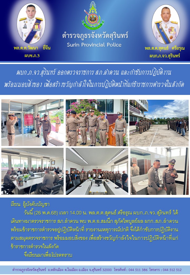 26 พ.ค. 2568 16:40:07 วันนี้ (26 พ.ค.68) เวลา 14.00 น. พล.ต.ต.สุคนธ์ ศรีอรุณ ผบก.ภ.จว.สุรินทร์ ได้เดินทางมาตรวจราชการ สภ.ลำดวน พบ พ.ต.อ.สมนึก สุภัคไพบูลย์ผล ผกก.สภ.ลำดวน พร้อมข้าราชการตำรวจอยู่ปฏิบัติหน้าที่ รายงานเหตุการณ์ปกติ จึงได้กำชับการปฏิบัติงาน ตามสมุดตรวจราชการ พร้อมมอบสิ่งของ เพื่อสร้างขวัญกำลังใจในการปฏิบัติ...