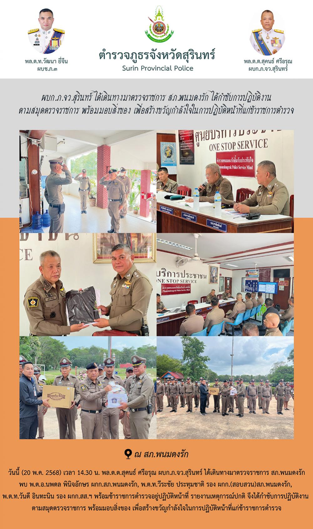20 พ.ค. 2568 16:26:12ผบก.ภ.จว.สุรินทร์ ได้เดินทางมาตรวจราชการ สภ.พนมดงรัก ได้กำชับการปฏิบัติงาน ตามสมุดตรวจราชการ พร้อมมอบสิ่งของ เพื่อสร้างขวัญกำลังใจในการปฏิบัติหน้าที่แก่ข้าราชการตำรวจ วันนี้ (20 พ.ค. 2568) เวลา 14.30 น. พล.ต.ต.สุคนธ์ ศรีอรุณ ผบก.ภ.จว.สุรินทร์ ได้เดินทางมาตรวจราชการ สภ.พนมดงรัก พบ พ.ต.อ.นพดล พินิจ...
