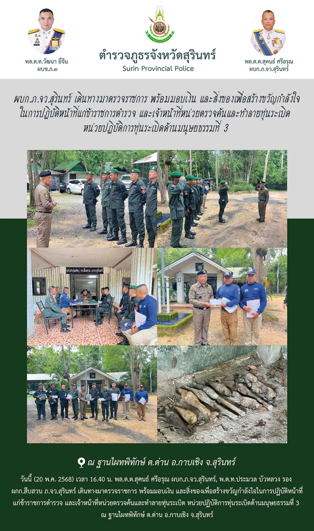20 พ.ค. 2568 18:06:34ผบก.ภ.จว.สุรินทร์ เดินทางมาตรวจราชการ พร้อมมอบเงิน และสิ่งของเพื่อสร้างขวัญกำลังใจ ในการปฏิบัติหน้าที่แก่ข้าราชการตำรวจ และเจ้าหน้าที่หน่วยตรวจค้นและทำลายทุ่นระเบิด หน่วยปฏิบัติการทุ่นระเบิดด้านมนุษยธรรมที่ 3 วันนี้ (20 พ.ค. 2568) เวลา 16.40 น. พล.ต.ต.สุคนธ์ ศรีอรุณ ผบก.ภ.จว.สุรินทร์, พ.ต.ท.ประมว...