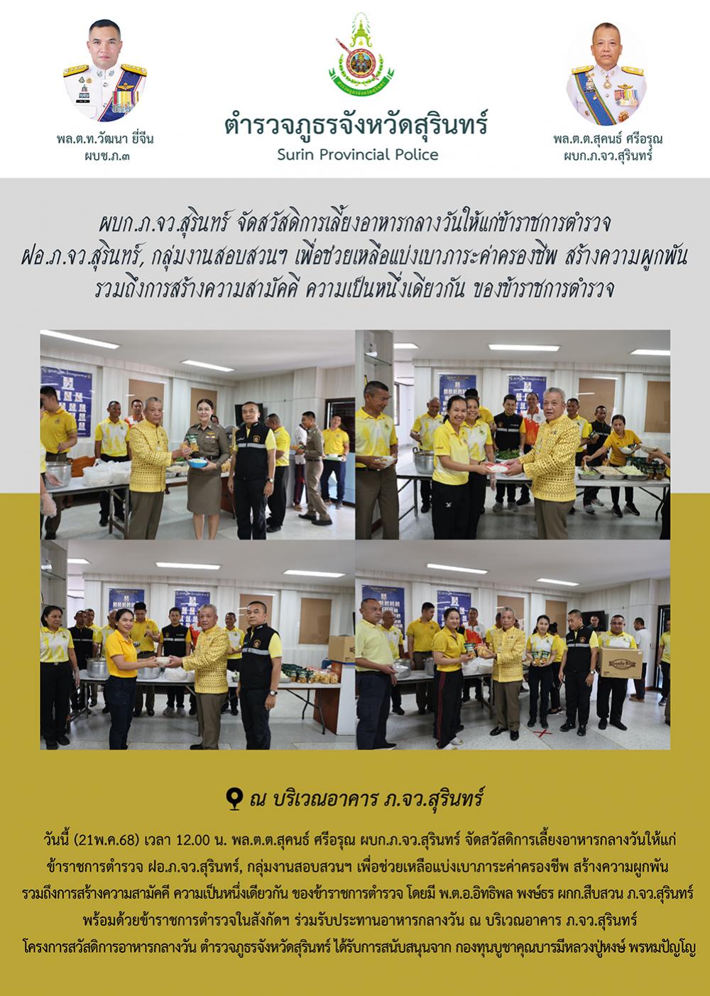 21 พ.ค. 2568 16:09:25ผบก.ภ.จว.สุรินทร์ จัดสวัสดิการเลี้ยงอาหารกลางวันให้แก่ข้าราชการตำรวจ ฝอ.ภ.จว.สุรินทร์, กลุ่มงานสอบสวนฯ เพื่อช่วยเหลือแบ่งเบาภาระค่าครองชีพ สร้างความผูกพัน รวมถึงการสร้างความสามัคคี ความเป็นหนึ่งเดียวกัน ของข้าราชการตำรวจ วันนี้ (21พ.ค.68) เวลา 12.00 น. พล.ต.ต.สุคนธ์ ศรีอรุณ ผบก.ภ.จว.สุรินทร์ จัดสวั...