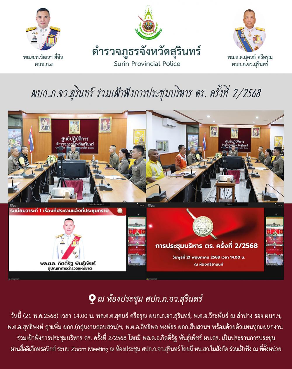 21 พ.ค. 2568 16:22:25ผบก.ภ.จว.สุรินทร์ ร่วมเฝ้าฟังการประชุมบริหาร ตร. ครั้งที่ 2/2568 วันนี้ (21 พ.ค.2568) เวลา 14.00 น. พล.ต.ต.สุคนธ์ ศรีอรุณ ผบก.ภ.จว.สุรินทร์, พ.ต.อ.วีระพันธ์ ณ ลำปาง รอง ผบก.ฯ, พ.ต.อ.สุทธิพงษ์ สุขเพิ่ม ผกก.(กลุ่มงานสอบสวน)ฯ, พ.ต.อ.อิทธิพล พงษ์ธร ผกก.สืบสวนฯ พร้อมด้วยตัวแทนทุกแผนกงาน ร่วมเฝ้าฟังกา...