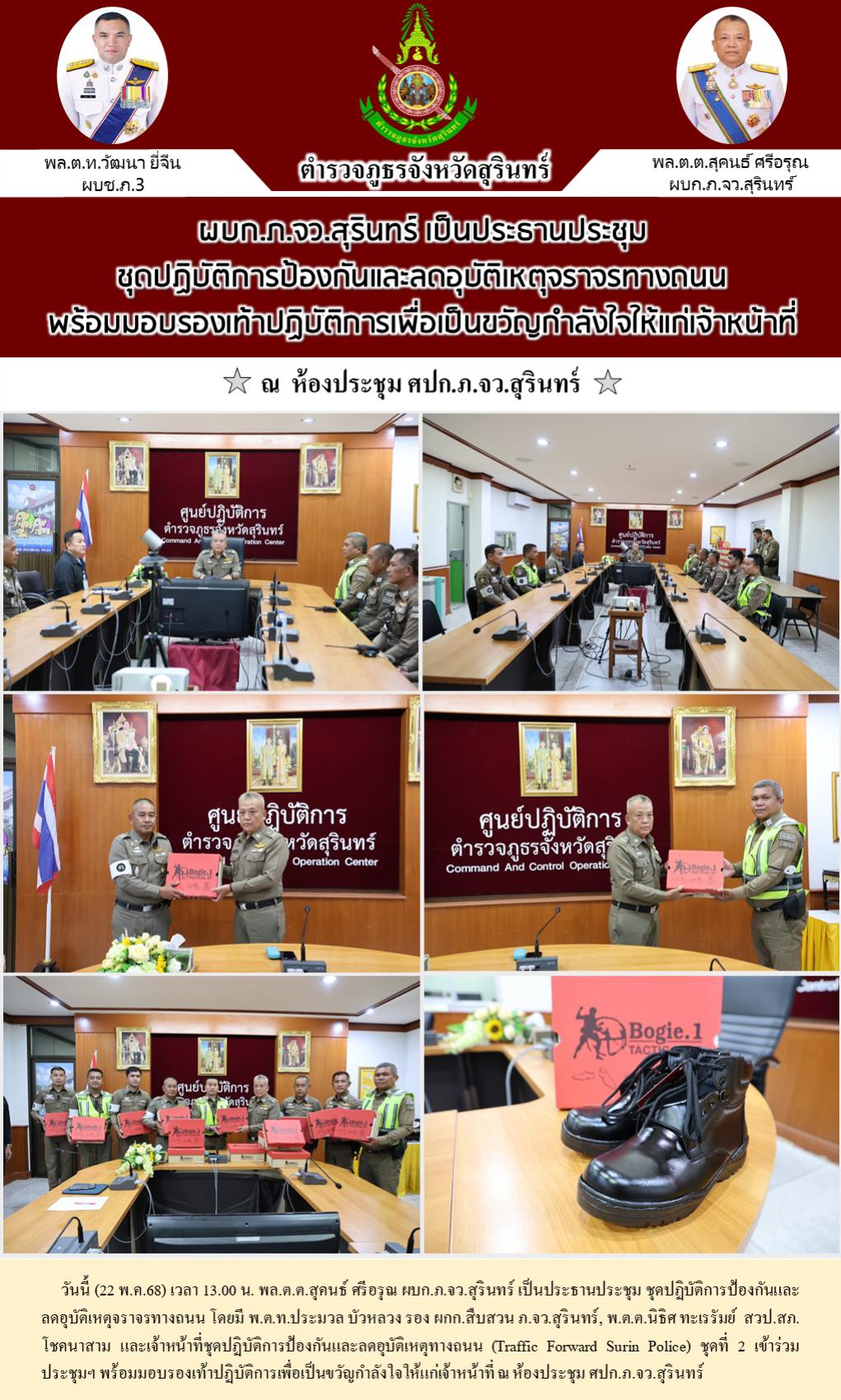 22 พ.ค. 2568 18:38:32ผบก.ภ.จว.สุรินทร์ เป็นประธานประชุม ชุดปฏิบัติการป้องกันและลดอุบัติเหตุจราจรทางถนน พร้อมมอบรองเท้าปฏิบัติการเพื่อเป็นขวัญกำลังใจให้แก่เจ้าหน้าที่ วันนี้ (22 พ.ค.68) เวลา 13.00 น. พล.ต.ต.สุคนธ์ ศรีอรุณ ผบก.ภ.จว.สุรินทร์ เป็นประธานประชุม ชุดปฏิบัติการป้องกันและลดอุบัติเหตุจราจรทางถนน โดยมี พ.ต.ท...