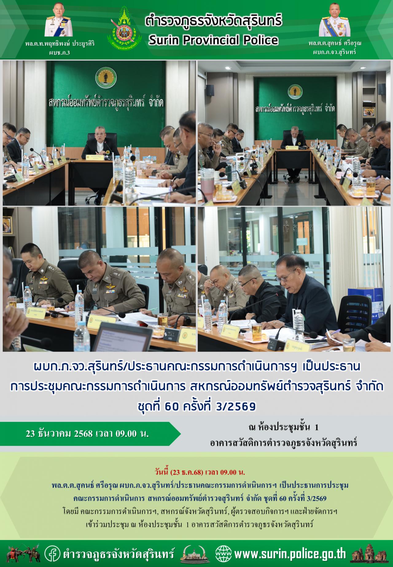 23 ธ.ค. 2568 17:58:28 วันนี้ (23 ธ.ค.68) เวลา 09.00 น. พล.ต.ต.สุคนธ์ ศรีอรุณ ผบก.ภ.จว.สุรินทร์/ประธานคณะกรรมการดำเนินการฯ เป็นประธานการประชุมคณะกรรมการดำเนินการ สหกรณ์ออมทรัพย์ตำรวจสุรินทร์ จำกัด ชุดที่ 60 ครั้งที่ 3/2569 โดยมี คณะกรรมการดำเนินการฯ, สหกรณ์จังหวัดสุรินทร์, ผู้ตรวจสอบกิจการฯ และฝ่ายจัดการฯ เข้าร่วมประชุม ...