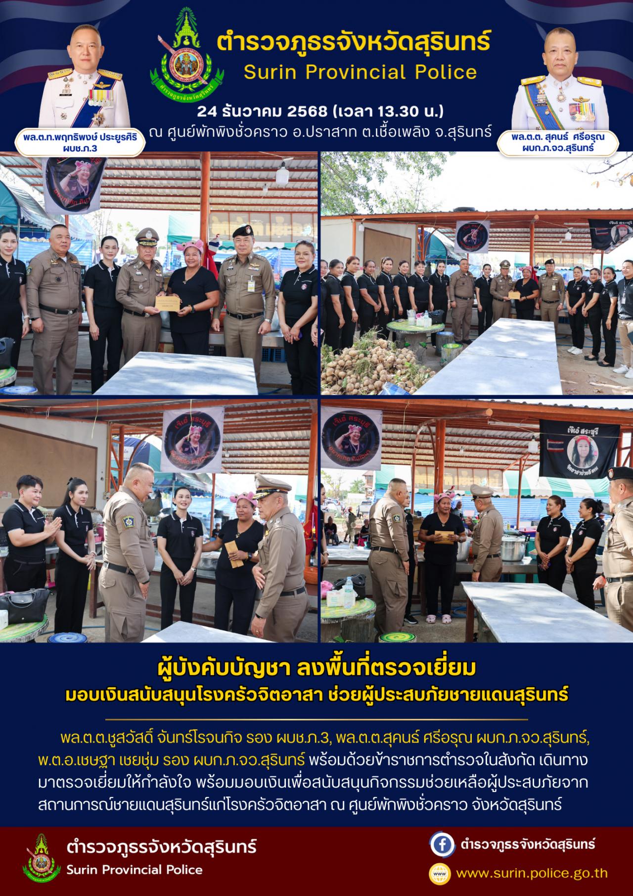 24 ธ.ค. 2568 20:09:31ตรวจเยี่ยมให้กำลังใจ และมอบเงินเพื่อสนับสนุนกิจกรรมช่วยเหลือผู้ประสบภัยจากสถานการณ์ชายแดนสุรินทร์แก่โรงครัวจิตอาสา ณ ศูนย์พักพิงชั่วคราว จังหวัดสุรินทร์ วันนี้ (24 ธ.ค.68) เวลา 13.30 น. พล.ต.ต.ชูสวัสดิ์ จันทร์โรจนกิจ รอง ผบช.ภ.3, พล.ต.ต.สุคนธ์ ศรีอรุณ ผบก.ภ.จว.สุรินทร์, พ.ต.อ.เชษฐา เชยชุ่ม รอง ผบก....