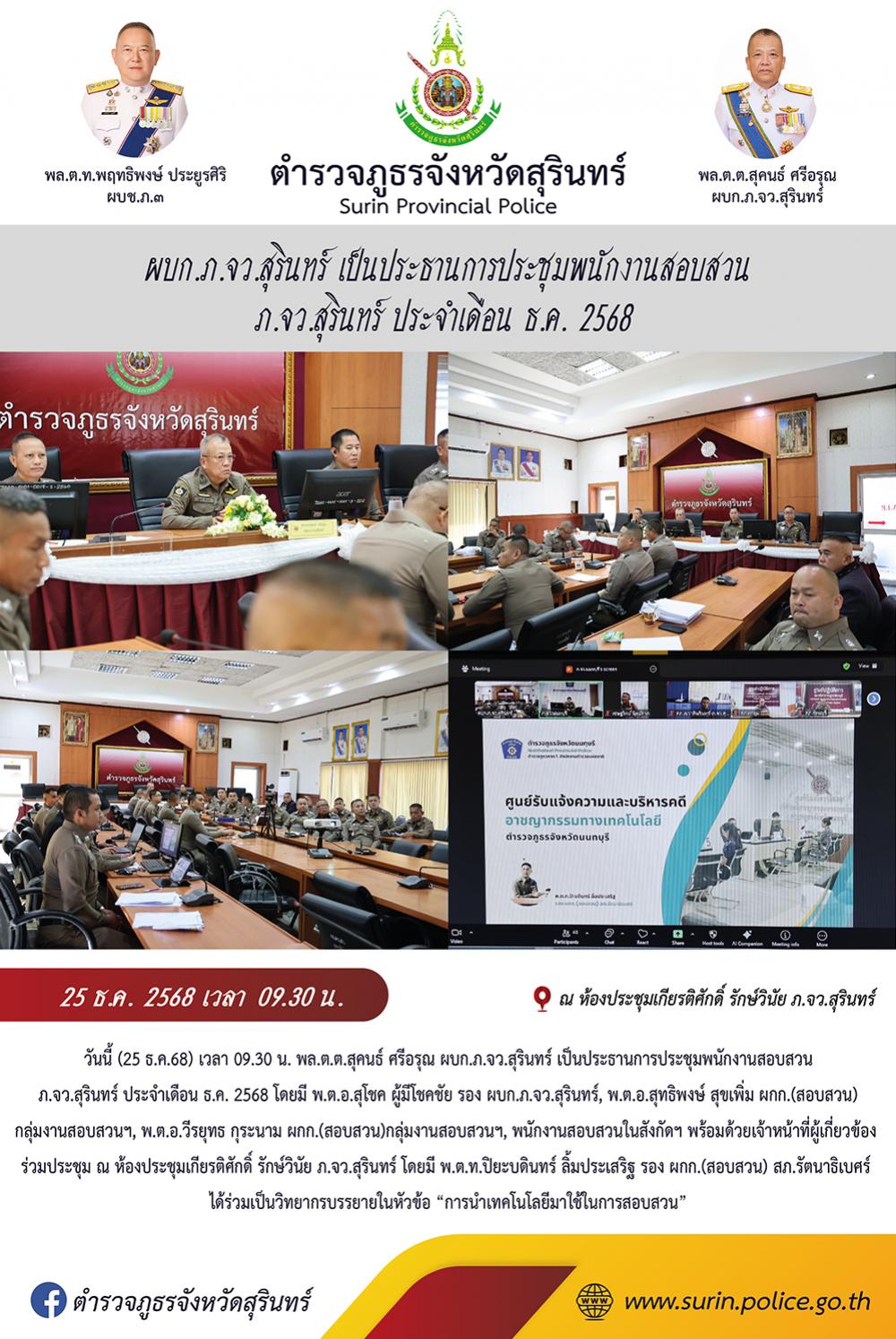 25 ธ.ค. 2568 13:56:47ผบก.ภ.จว.สุรินทร์ เป็นประธานการประชุมพนักงานสอบสวน ภ.จว.สุรินทร์ ประจำเดือน ธ.ค. 2568 วันนี้ (25 ธ.ค.68) เวลา 09.30 น. พล.ต.ต.สุคนธ์ ศรีอรุณ ผบก.ภ.จว.สุรินทร์ เป็นประธานการประชุมพนักงานสอบสวน ภ.จว.สุรินทร์ ประจำเดือน ธ.ค. 2568 โดยมี พ.ต.อ.สุโชค ผู้มีโชคชัย รอง ผบก.ภ.จว.สุรินทร์, พ.ต.อ.สุทธิพงษ์ ...