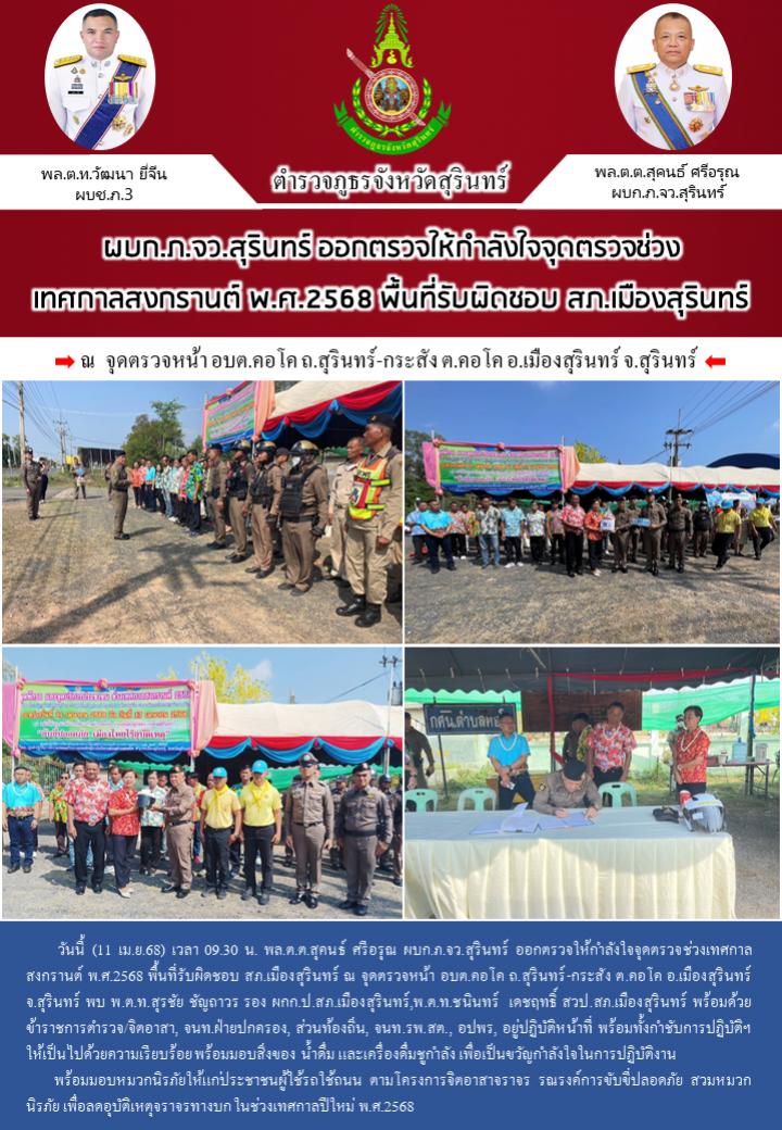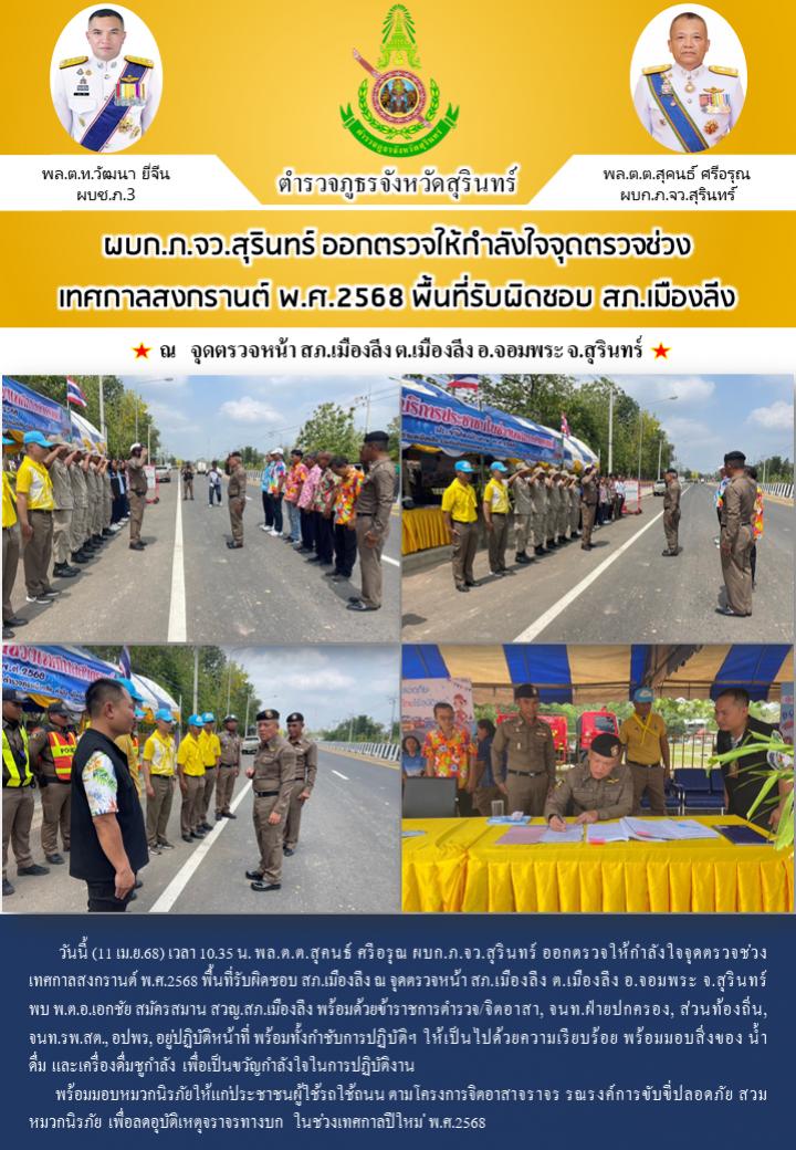 11 เม.ย. 2568 13:08:47 วันนี้ (11 เม.ย.68) เวลา 10.35 น. พล.ต.ต.สุคนธ์ ศรีอรุณ ผบก.ภ.จว.สุรินทร์ ออกตรวจให้กำลังใจจุดตรวจช่วงเทศกาลสงกรานต์ พ.ศ.2568 พื้นที่รับผิดชอบ สภ.เมืองลีง ณ จุดตรวจหน้า สภ.เมืองลีง ต.เมืองลีง อ.จอมพระ จ.สุรินทร์ พบ พ.ต.อ.เอกชัย สมัครสมาน สวญ.สภ.เมืองลีง พร้อมด้วยข้าราชการตำรวจ/จิตอาสา, จนท....