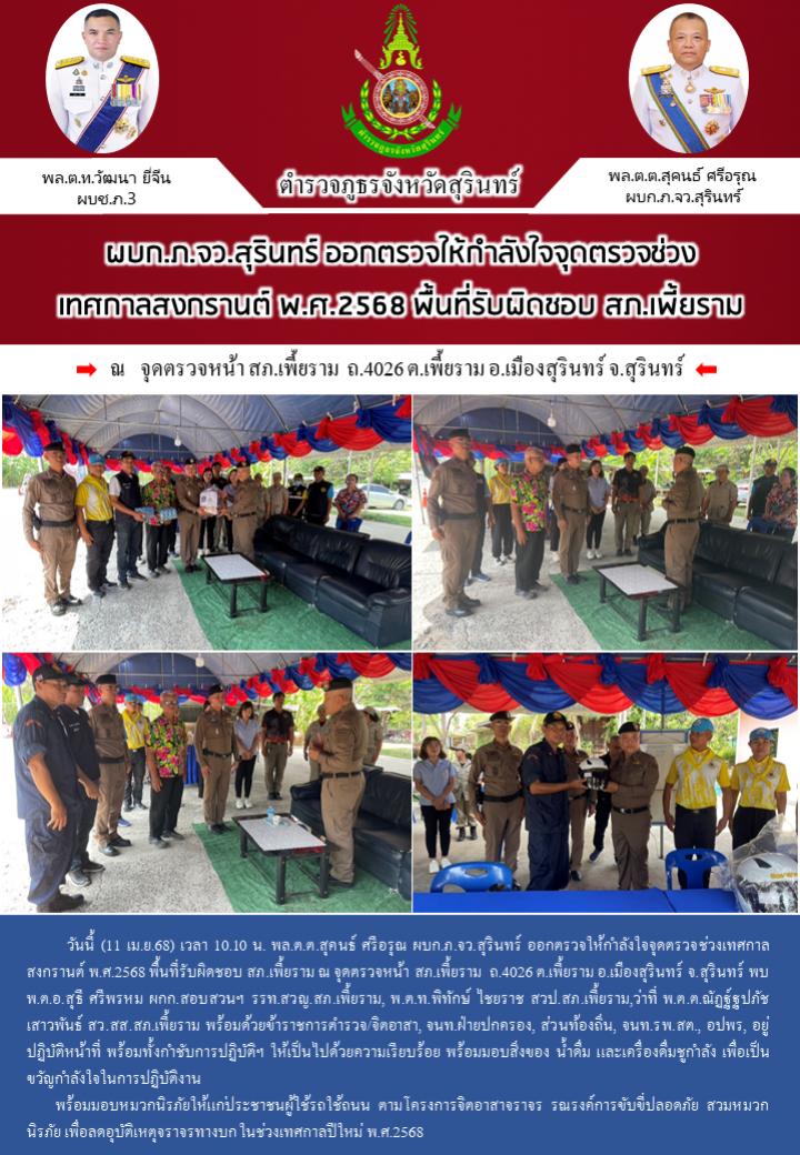 11 เม.ย. 2568 13:08:42 วันนี้ (11 เม.ย.68) เวลา 10.10 น. พล.ต.ต.สุคนธ์ ศรีอรุณ ผบก.ภ.จว.สุรินทร์ ออกตรวจให้กำลังใจจุดตรวจช่วงเทศกาลสงกรานต์ พ.ศ.2568 พื้นที่รับผิดชอบ สภ.เพี้ยราม ณ จุดตรวจหน้า สภ.เพี้ยราม ถ.4026 ต.เพี้ยราม อ.เมืองสุรินทร์ จ.สุรินทร์ พบ พ.ต.อ.สุธี ศรีพรหม ผกก.สอบสวนฯ รรท.สวญ.สภ.เพี้ยราม, พ.ต.ท.พิทัก...