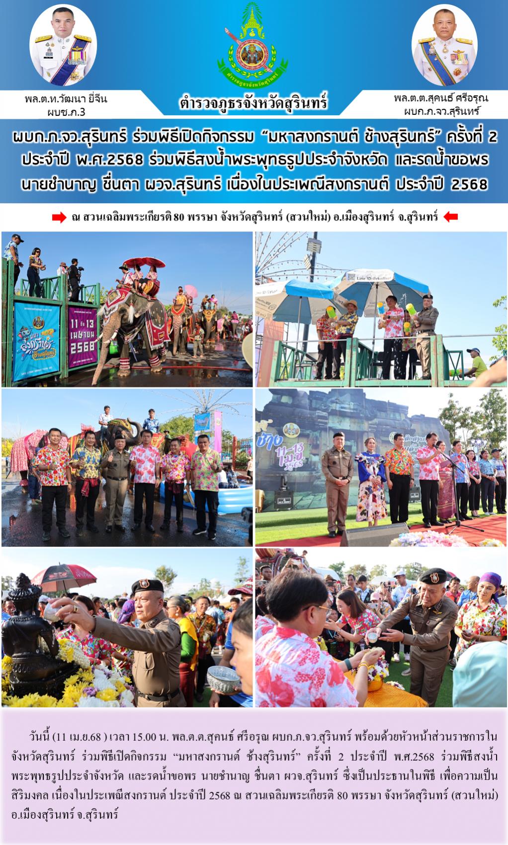 11 เม.ย. 2568 17:36:47ผบก.ภ.จว.สุรินทร์ ร่วมพิธีเปิดกิจกรรม “มหาสงกรานต์ ช้างสุรินทร์” ครั้งที่ 2 ประจำปี พ.ศ.2568 ร่วมพิธีสงน้ำพระพุทธรูปประจำจังหวัด และรดน้ำขอพร นายชำนาญ ชื่นตา ผวจ.สุรินทร์ เนื่องในประเพณีสงกรานต์ ประจำปี 2568 วันนี้ (11 เม.ย.68 ) เวลา 15.00 น. พล.ต.ต.สุคนธ์ ศรีอรุณ ผบก.ภ.จว.สุรินทร์ พร้อมด้ว...