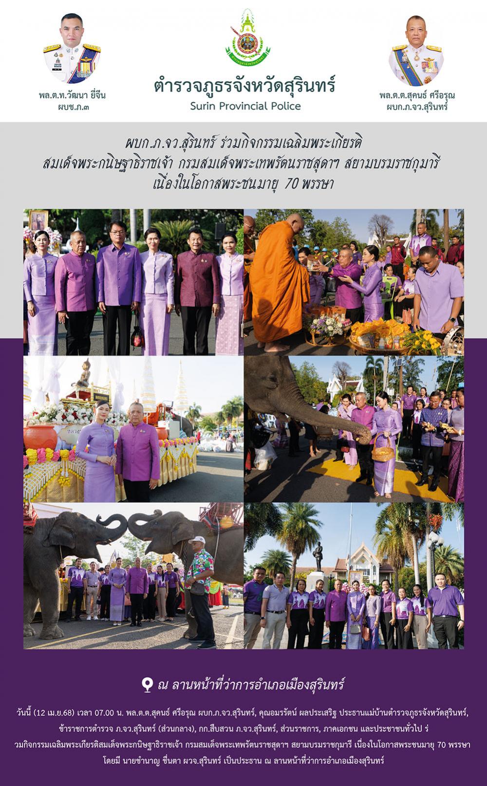 12 เม.ย. 2568 09:51:13ผบก.ภ.จว.สุรินทร์ ร่วมกิจกรรมเฉลิมพระเกียรติ สมเด็จพระกนิษฐาธิราชเจ้า กรมสมเด็จพระเทพรัตนราชสุดาฯ สยามบรมราชกุมารี เนื่องในโอกาสพระชนมายุ 70 พรรษา วันนี้ (12 เม.ย.68) เวลา 07.00 น. พล.ต.ต.สุคนธ์ ศรีอรุณ ผบก.ภ.จว.สุรินทร์, คุณอมรรัตน์ ผลประเสริฐ ประธานแม่บ้านตำรวจภูธรจังหวัดสุรินทร์, ข้าราชการตำรว...