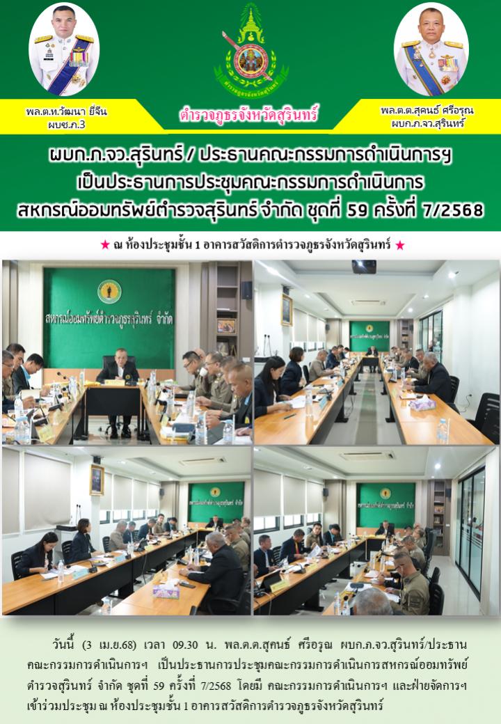 3 เม.ย. 2568 17:23:00ผบก.ภ.จว.สุรินทร์ / ประธานคณะกรรมการดำเนินการฯ เป็นประธานการประชุมคณะกรรมการดำเนินการสหกรณ์ออมทรัพย์ตำรวจสุรินทร์ จำกัด ชุดที่ 59 ครั้งที่ 7/2568 วันนี้ (3 เม.ย.68) เวลา 09.30 น. พล.ต.ต.สุคนธ์ ศรีอรุณ ผบก.ภ.จว.สุรินทร์/ประธานคณะกรรมการดำเนินการฯ เป็นประธานการประชุมคณะกรรมการดำเนินการสหกร...