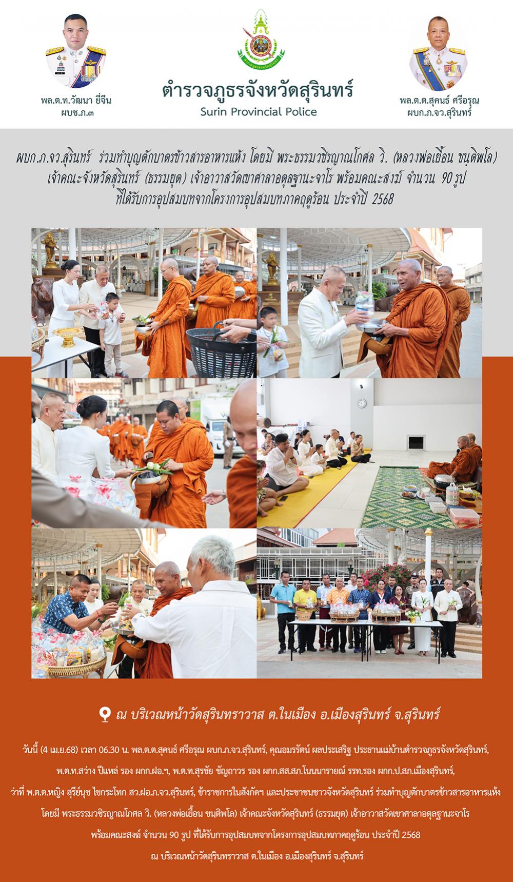 4 เม.ย. 2568 09:40:20ผบก.ภ.จว.สุรินทร์ ร่วมทำบุญตักบาตรข้าวสารอาหารแห้ง โดยมี พระธรรมวชิรญาณโกศล วิ. (หลวงพ่อเยื้อน ขนฺติพโล) เจ้าคณะจังหวัดสุรินทร์ (ธรรมยุต) เจ้าอาวาสวัดเขาศาลาอตุลฐานะจาโร พร้อมคณะสงฆ์ จำนวน 90 รูป ที่ได้รับการอุปสมบทจากโครงการอุปสมบทภาคฤดูร้อน ประจำปี 2568 วันนี้ (4 เม.ย.68) เวลา 06.30 น. พล.ต.ต.ส...