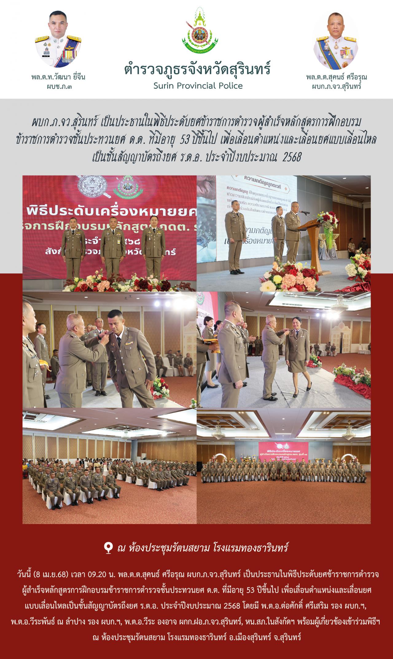 8 เม.ย. 2568 15:11:12ผบก.ภ.จว.สุรินทร์ เป็นประธานในพิธีประดับยศข้าราชการตำรวจผู้สำเร็จหลักสูตรการฝึกอบรม ข้าราชการตำรวจชั้นประทวนยศ ด.ต. ที่มีอายุ 53 ปีขึ้นไป เพื่อเลื่อนตำแหน่งและเลื่อนยศแบบเลื่อนไหล เป็นชั้นสัญญาบัตรถึงยศ ร.ต.อ. ประจำปีงบประมาณ 2568 วันนี้ (8 เม.ย.68) เวลา 09.20 น. พล.ต.ต.สุคนธ์ ศรีอรุณ ผบก.ภ.จว.สุร...