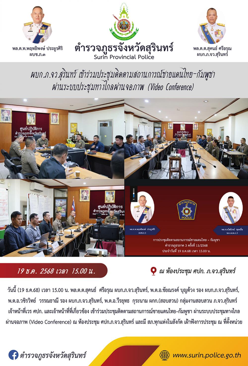 19 ธ.ค. 2568 16:25:40ผบก.ภ.จว.สุรินทร์ เข้าร่วมประชุมติดตามสถานการณ์ชายแดนไทย-กัมพูชา ผ่านระบบประชุมทางไกลผ่านจอภาพ (Video Conference) วันนี้ (19 ธ.ค.68) เวลา 15.00 น. พล.ต.ต.สุคนธ์ ศรีอรุณ ผบก.ภ.จว.สุรินทร์, พ.ต.อ.ชัยณรงค์ บุญด้วง รอง ผบก.ภ.จว.สุรินทร์, พ.ต.อ.วชิรวิทย์ วรรณธาณี รอง ผบก.ภ.จว.สุรินทร์, พ.ต.อ.วีรยุทธ ...