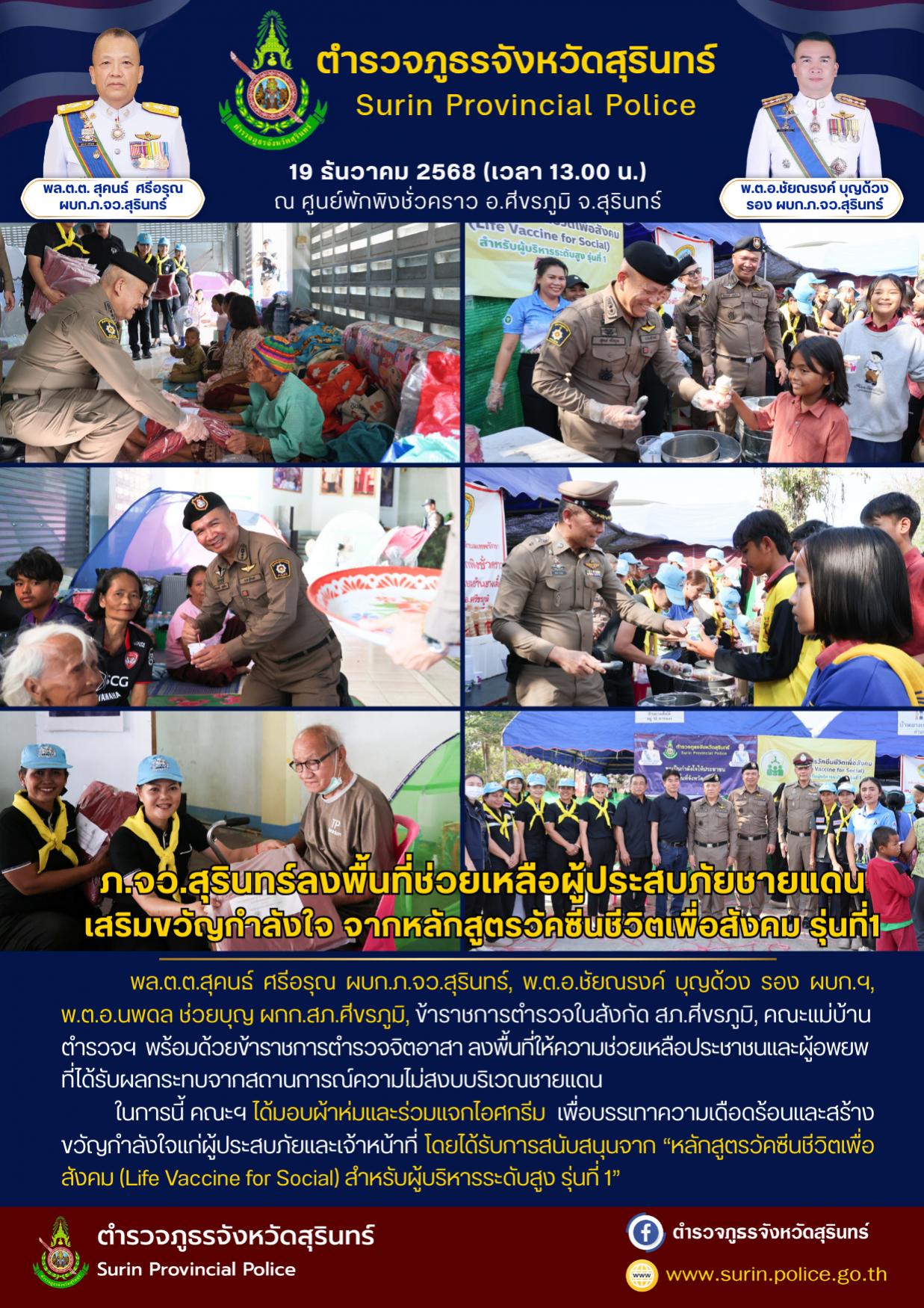 21 ธ.ค. 2568 21:06:39 ลงพื้นที่ให้ความช่วยเหลือประชาชนและผู้อพยพที่ได้รับผลกระทบจากสถานการณ์ความไม่สงบบริเวณชายแดน วันที่ 19 ธ.ค.68 เวลา 13.00 น. พล.ต.ต.สุคนธ์ ศรีอรุณ ผบก.ภ.จว.สุรินทร์, พ.ต.อ.ชัยณรงค์ บุญด้วง รอง ผบก.ภ.จว.สุรินทร์, พ.ต.อ.นพดล ช่วยบุญ ผกก.สภ.ศีขรภูมิ, พ.ต.ท.ชัยรุตน์ สมานรัตน์ รอง ผกก.ป.สภ.ศีขรภูมิ ,...