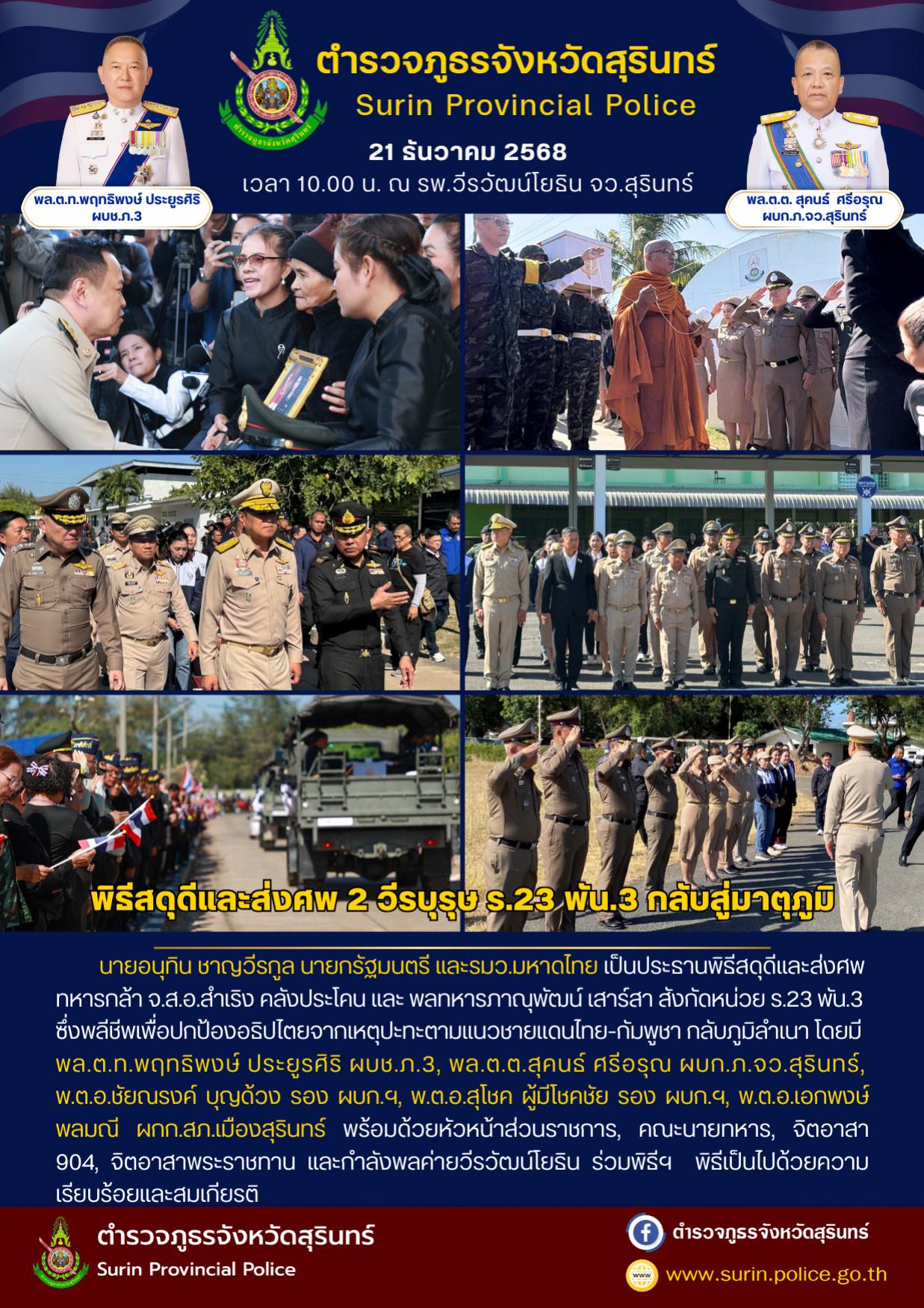 21 ธ.ค. 2568 21:09:25วันนี้ (21 ธ.ค. 68) เวลา 10.00 น. นายอนุทิน ชาญวีรกูล นายกรัฐมนตรี และรมว.มหาดไทย เป็นประธานพิธีสดุดีและส่งศพทหารกล้า จ.ส.อ.สำเริง คลังประโคน และ พลทหารภาณุพัฒน์ เสาร์สา สังกัดหน่วย ร.23 พัน.3 ซึ่งพลีชีพเพื่อปกป้องอธิปไตยจากเหตุปะทะตามแนวชายแดนไทย-กัมพูชา กลับภูมิลำเนา โดยมี พล.ต.ท.พฤทธิพงษ์ ประยู...