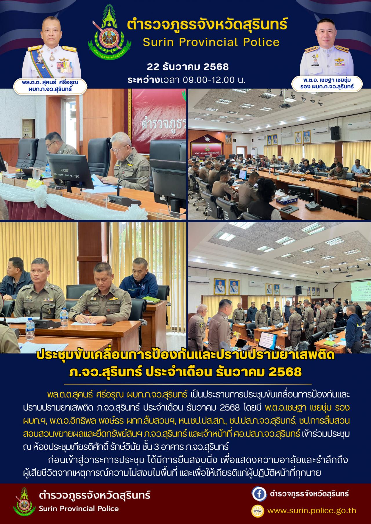 22 ธ.ค. 2568 13:14:50 วันนี้ (22 ธ.ค.68) เวลา 09.00 น. พล.ต.ต.สุคนธ์ ศรีอรุณ ผบก.ภ.จว.สุรินทร์ เป็นประธานการประชุมขับเคลื่อนการป้องกันและปราบปรามยาเสพติด ภ.จว.สุรินทร์ ประจำเดือน ธันวาคม 2568 โดยมี พ.ต.อ.เชษฐา เชยชุ่ม รอง ผบก.ฯ, พ.ต.อ.อิทธิพล พงษ์ธร ผกก.สืบสวนฯ, หน.ชป.ปส.สภ., ชป.ปส.ภ.จว.สุรินทร์, ชป.การสืบสวนสอบสวนขยาย...