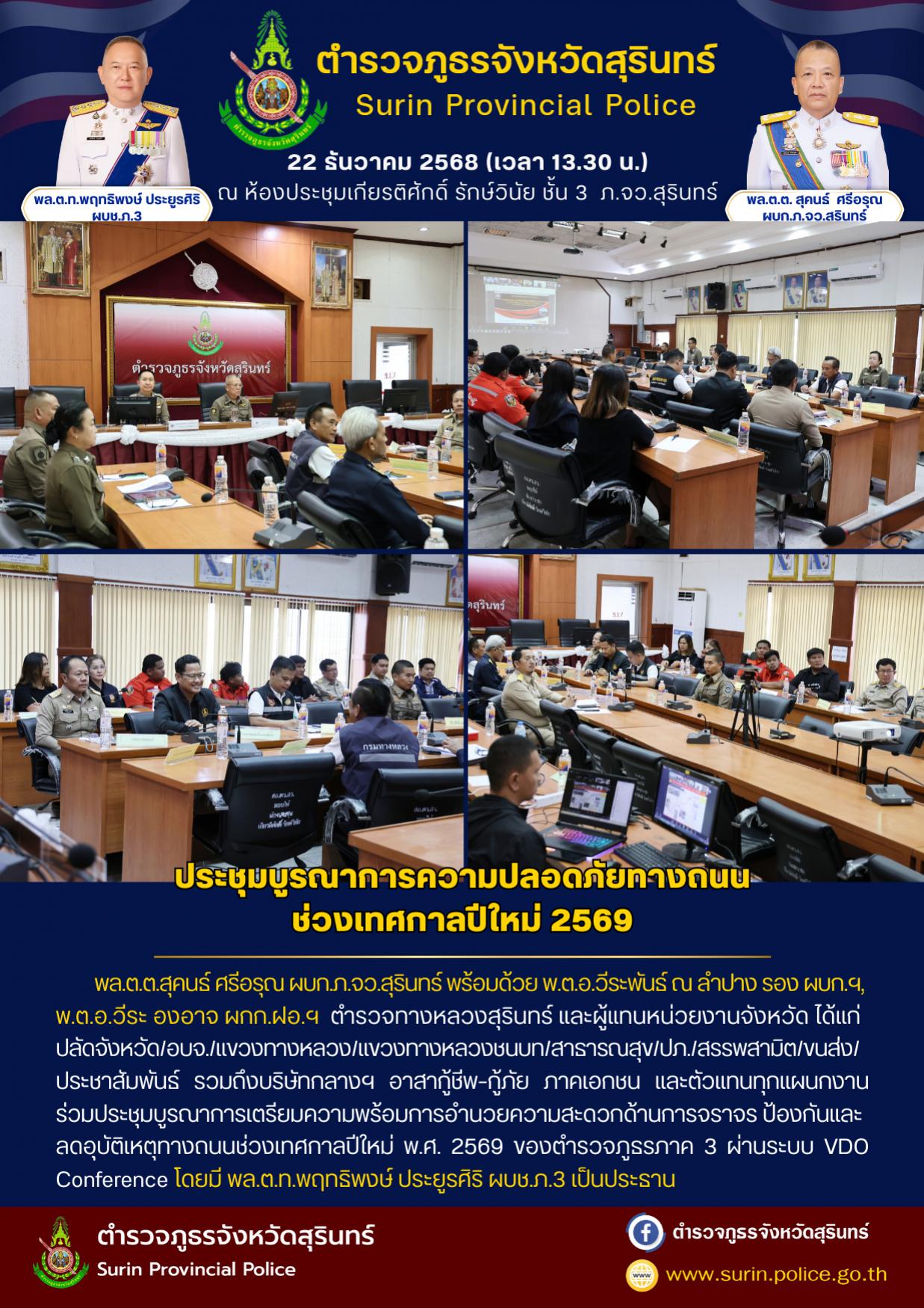 22 ธ.ค. 2568 16:52:57 ร่วมประชุมบูรณาการเตรียมความพร้อมการอำนวยความสะดวกด้านการจราจร ป้องกันและลดอุบัติเหตุทางถนน ช่วงเทศกาลปีใหม่ พ.ศ.2569 ของ ภ.3 วันนี้ (22 ธ.ค.68 ) เวลา 13.30 น. พล.ต.ต.สุคนธ์ ศรีอรุณ ผบก.ภ.จว.สุรินทร์, พ.ต.อ.วีระพันธ์ ณ ลำปาง รอง ผบก.ภ.จว.สุรินทร์, พ.ต.อ.วีระ องอาจ ผกก.ฝอ.ภ.จว.สุรินทร์, ตำรวจทางหลว...