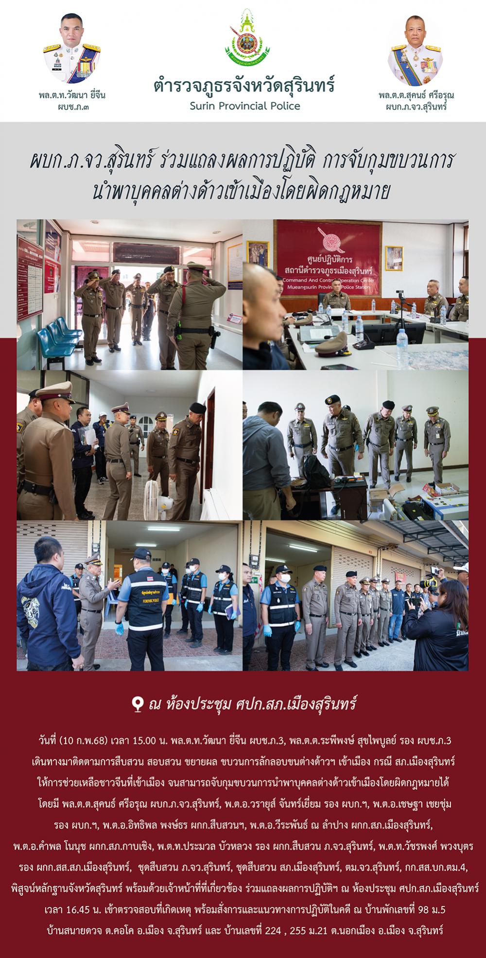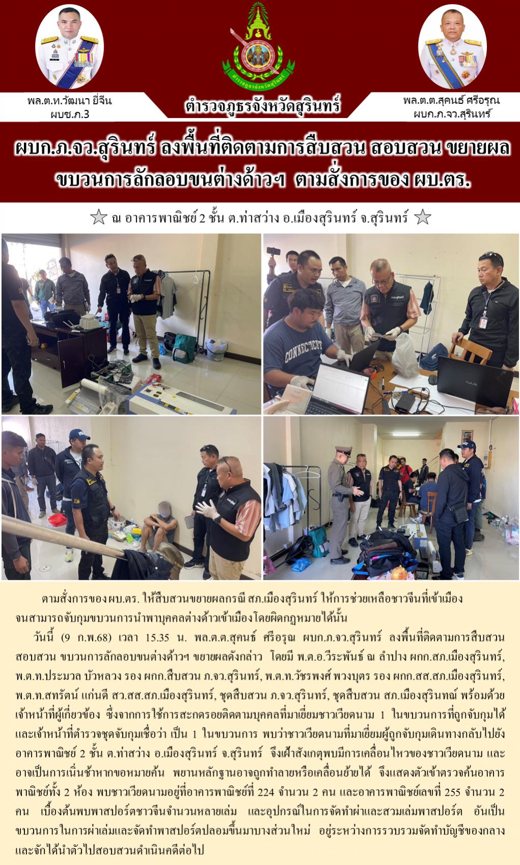 9 ก.พ. 2568 20:33:04ผบก.ภ.จว.สุรินทร์ ลงพื้นที่ติดตามการสืบสวน สอบสวน ขยายผล ขบวนการลักลอบขนต่างด้าวฯ ตามสั่งการของ ผบ.ตร. ตามสั่งการของ ผบ.ตร. ให้สืบสวนขยายผลกรณี สภ.เมืองสุรินทร์ ให้การช่วยเหลือชาวจีนที่เข้าเมือง จนสามารถจับกุมขบวนการนำพาบุคคลต่างด้าวเข้าเมืองโดยผิดกฏหมายได้นั้น วันนี้ (9 ก....