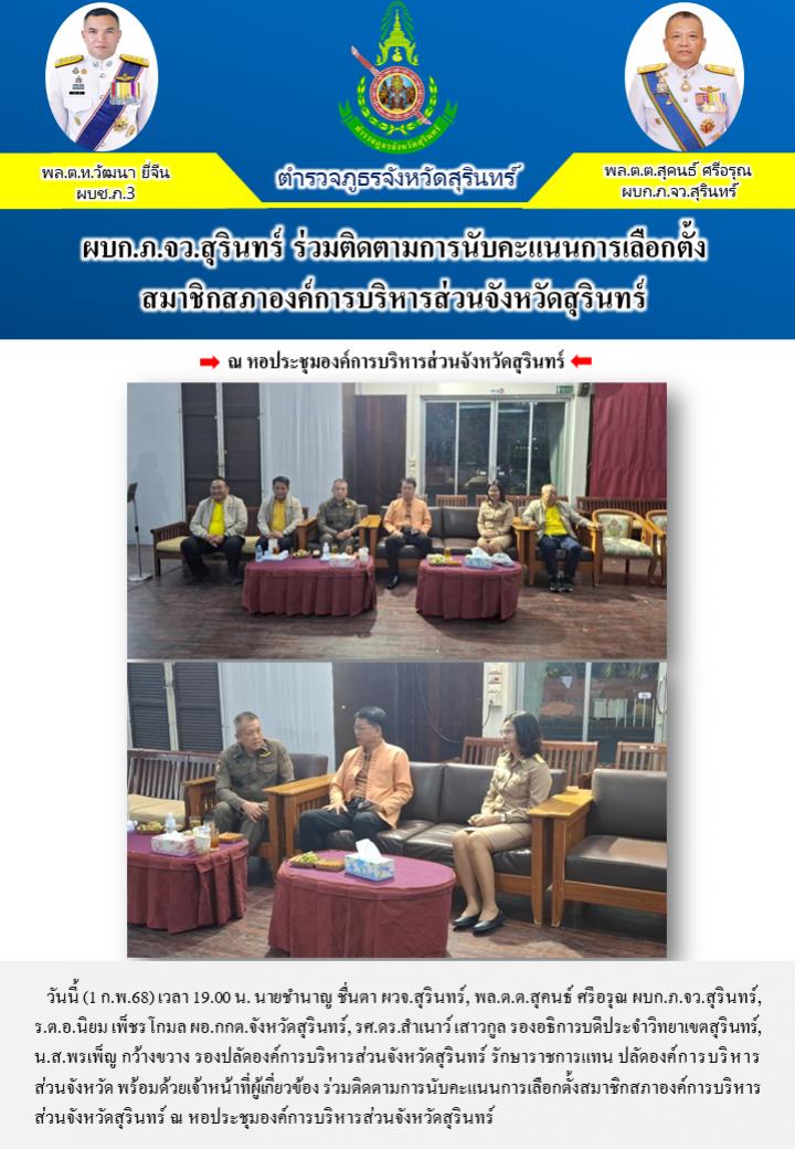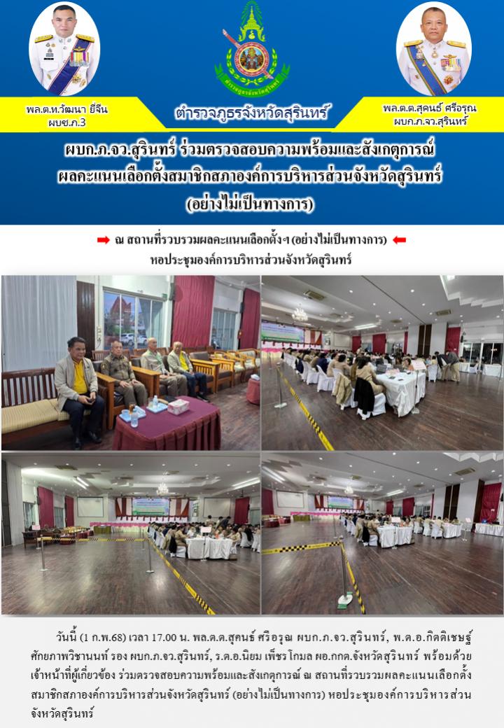 1 ก.พ. 2568 18:59:25ผบก.ภ.จว.สุรินทร์ ร่วมตรวจสอบความพร้อมและสังเกตุการณ์ ผลคะแนนเลือกตั้งสมาชิกสภาองค์การบริหารส่วนจังหวัดสุรินทร์ (อย่างไม่เป็นทางการ) วันนี้ (1 ก.พ.68) เวลา 17.00 น. พล.ต.ต.สุคนธ์ ศรีอรุณ ผบก.ภ.จว.สุรินทร์, พ.ต.อ.กิตติเชษฐ์ ศักยภาพวิชานนท์ รอง ผบก.ภ.จว.สุรินทร์, ร.ต.อ.นิยม เพ็ชรโกมล ผอ.กกต.จังหวัดส...