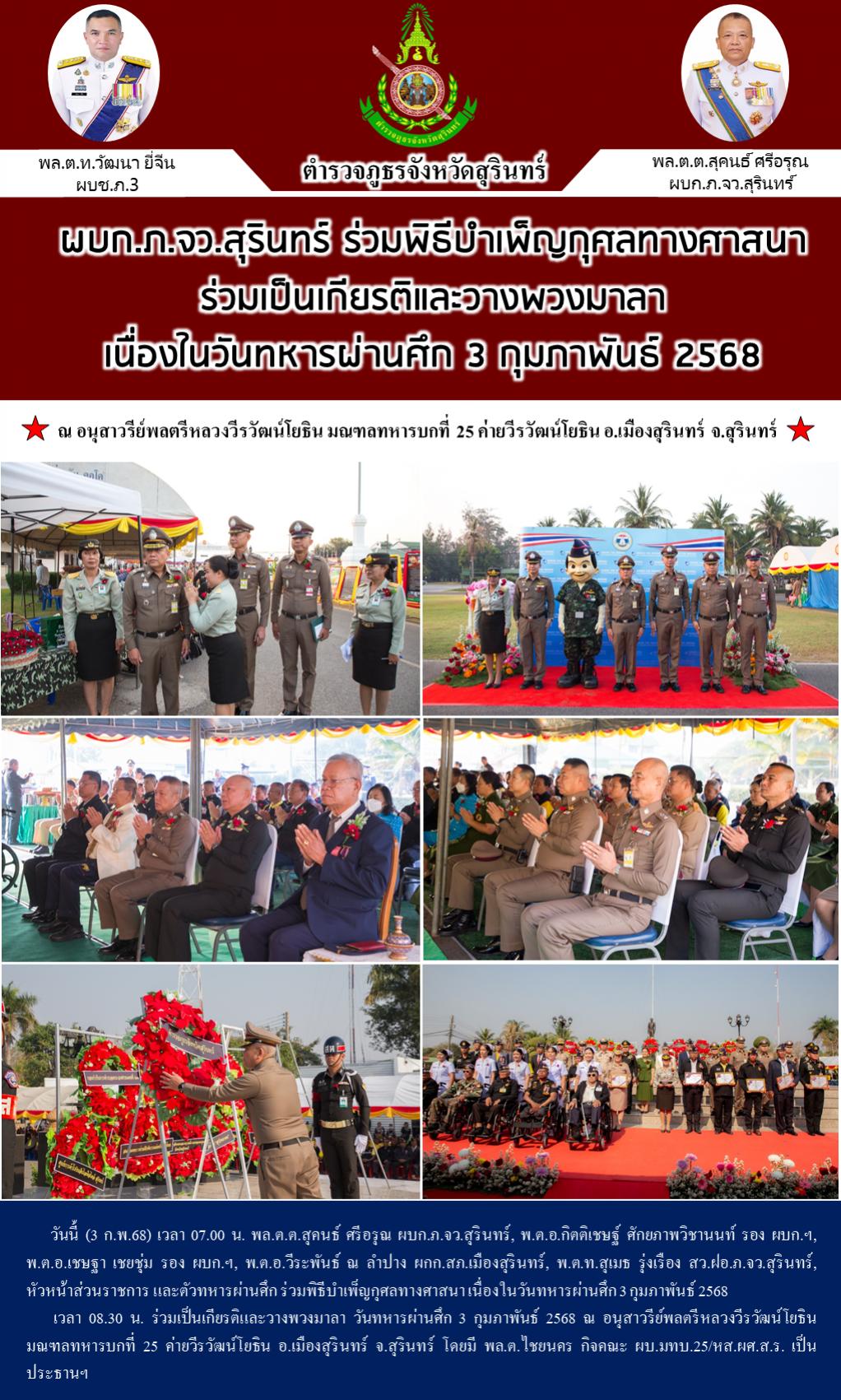3 ก.พ. 2568 15:12:02ผบก.ภ.จว.สุรินทร์ ร่วมพิธีบำเพ็ญกุศลทางศาสนา ร่วมเป็นเกียรติและวางพวงมาลา เนื่องในวันทหารผ่านศึก 3 กุมภาพันธ์ 2568 วันนี้ (3 ก.พ.68) เวลา 07.00 น. พล.ต.ต.สุคนธ์ ศรีอรุณ ผบก.ภ.จว.สุรินทร์, พ.ต.อ.กิตติเชษฐ์ ศักยภาพวิชานนท์ รอง ผบก.ฯ, พ.ต.อ.เชษฐา เชยชุ่ม รอง ผบก.ฯ, พ.ต.อ.วีระพันธ์ ณ ลำปาง ผกก.สภ...