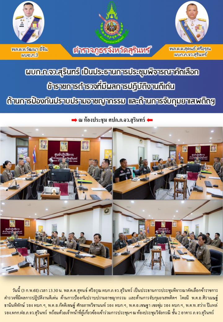 3 ก.พ. 2568 15:12:07 ผบก.ภ.จว.สุรินทร์ เป็นประธานการประชุมพิจารณาคัดเลือกข้าราชการตำรวจที่มีผลการปฏิบัติงานดีเด่น ด้านการป้องกันปราบปรามอาชญากรรม และด้านการจับกุมยาเสพติดฯ วันนี้ (3 ก.พ.68) เวลา 13.30 น. พล.ต.ต.สุคนธ์ ศรีอรุณ ผบก.ภ.จว.สุรินทร์ เป็นประธานการประชุมพิจารณาคัดเลือกข้าราชการตำรวจที่มีผลการปฏิบัติง...