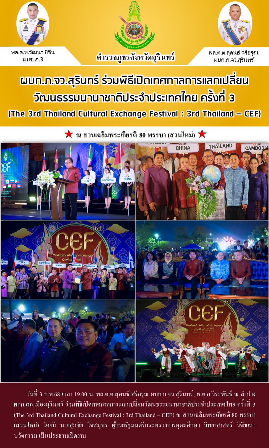 4 ก.พ. 2568 09:44:24ผบก.ภ.จว.สุรินทร์ ร่วมพิธีเปิดเทศกาลการแลกเปลี่ยวัฒนธรรมนานาชาติประจำประเทศไทย ครั้งที่ 3 (The 3rd Thailand Cultural Exchange Festival : 3rd Thailand – CEF) วันที่ 3 ก.พ.68 เวลา 19.00 น. พล.ต.ต.สุคนธ์ ศรีอรุณ ผบก.ภ.จว.สุรินทร์, พ.ต.อ.วีระพันธ์ ณ ลำปาง ผกก.สภ.เมืองสุรินทร์ ร่วมพิธีเปิดเทศกาลการแลก...
