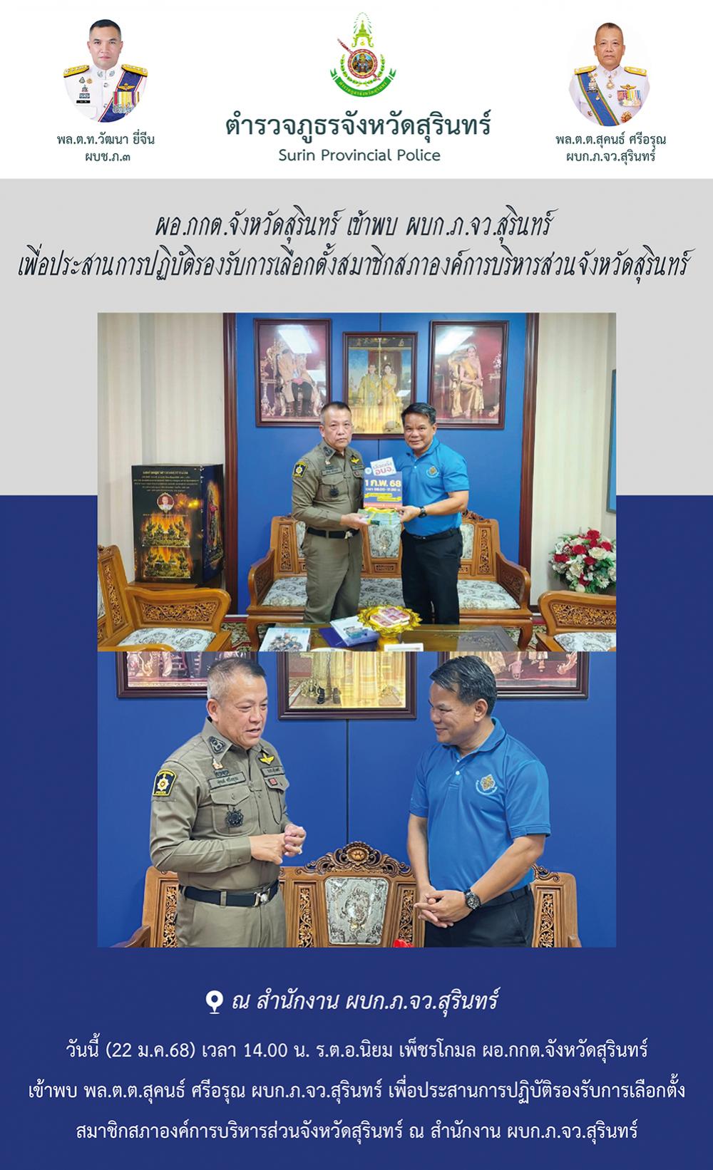 22 ม.ค. 2568 15:54:11 ผบก.ภ.จว.สุรินทร์ เพื่อประสานการปฏิบัติรองรับการเลือกตั้ง สมาชิกสภาองค์การบริหารส่วนจังหวัดสุรินทร์ วันนี้ (22 ม.ค.68) เวลา 14.00 น. ร.ต.อ.นิยม เพ็ชรโกมล ผอ.กกต.จังหวัดสุรินทร์ เข้าพบ พล.ต.ต.สุคนธ์ ศรีอรุณ ผบก.ภ.จว.สุรินทร์ เพื่อประสานการปฏิบัติรองรับการเลือกตั้ง สมาชิกสภาองค์การบริหารส่วนจังหวัดส...
