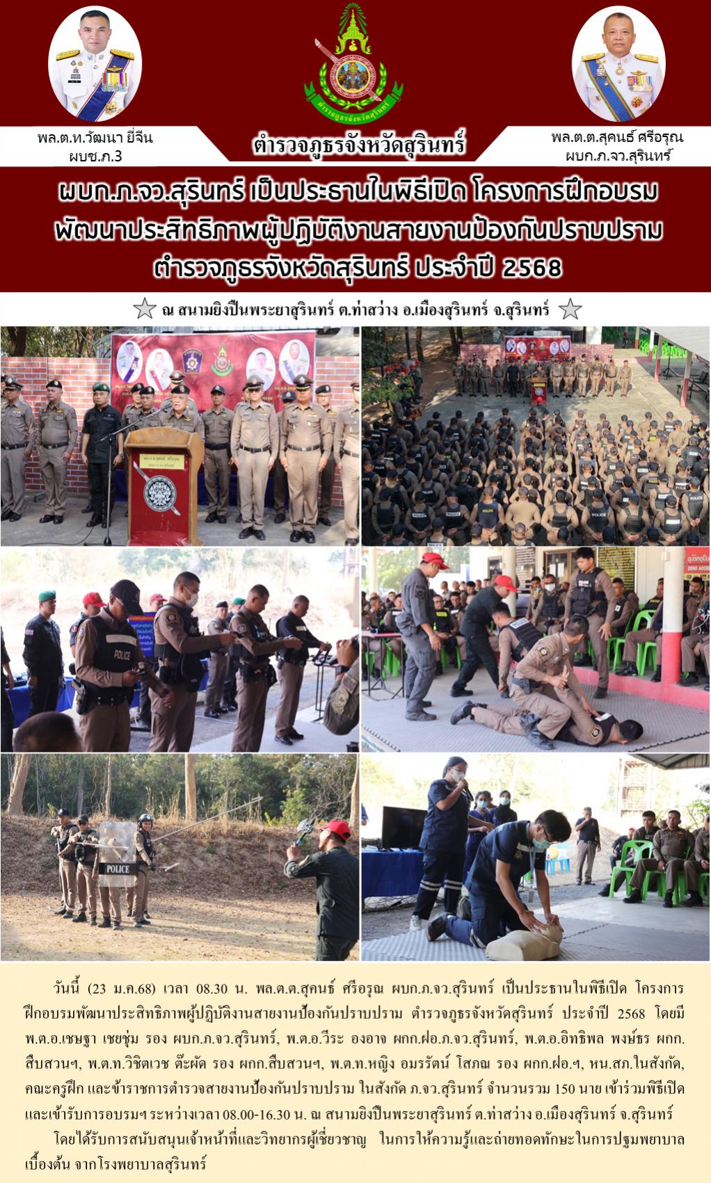 23 ม.ค. 2568 18:22:14ผบก.ภ.จว.สุรินทร์ เป็นประธานในพิธีเปิด โครงการฝึกอบรมพัฒนาประสิทธิภาพผู้ปฏิบัติงานสายงานป้องกันปราบปราม ตำรวจภูธรจังหวัดสุรินทร์ ประจำปี 2568 วันนี้ (23 ม.ค.68) เวลา 08.30 น. พล.ต.ต.สุคนธ์ ศรีอรุณ ผบก.ภ.จว.สุรินทร์ เป็นประธานในพิธีเปิด โครงการฝึกอบรมพัฒนาประสิทธิภาพผู้ปฏิบัติงานสายงานป้องกันปราบปรา...