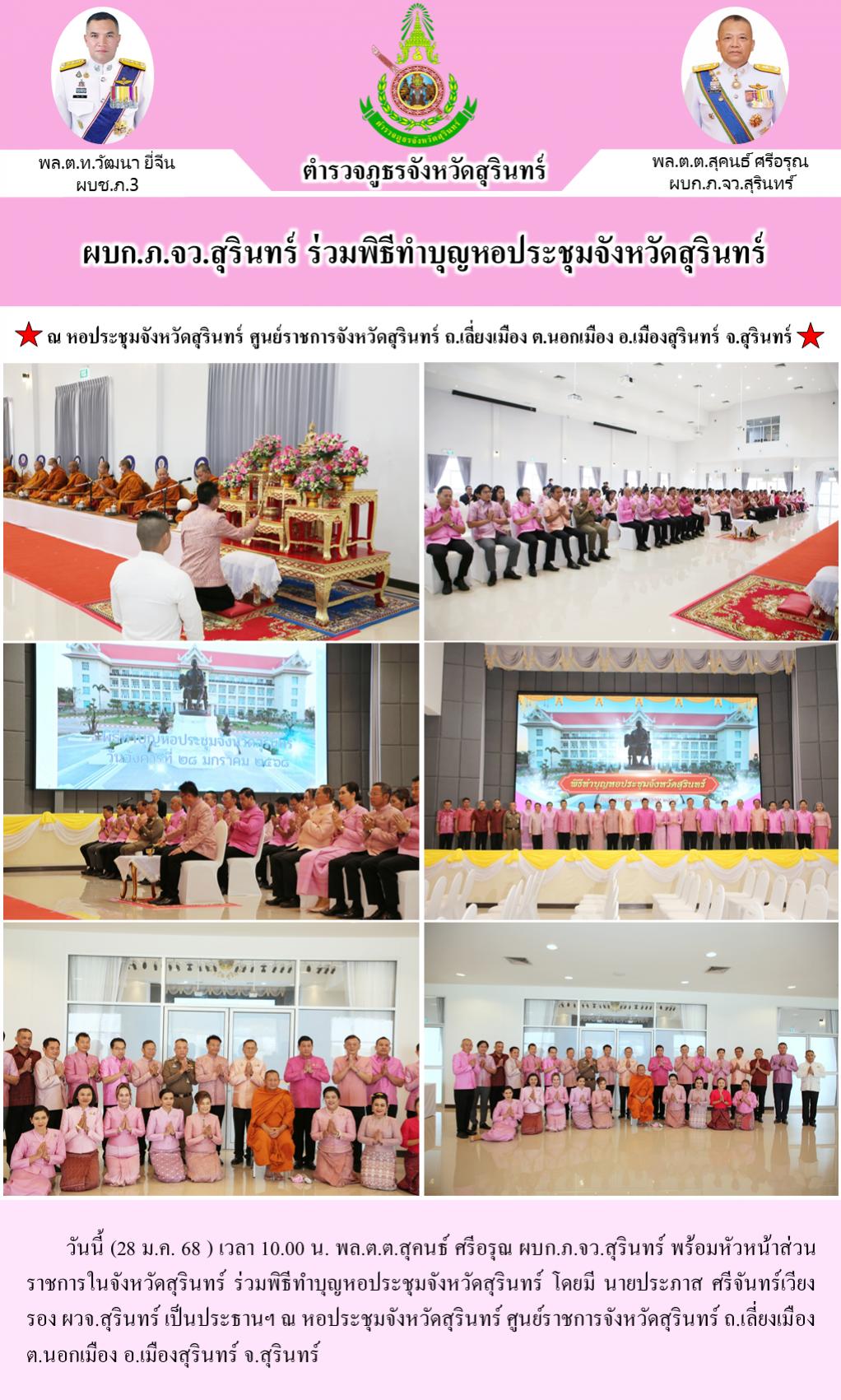28 ม.ค. 2568 16:08:12ผบก.ภ.จว.สุรินทร์ ร่วมพิธีทำบุญหอประชุมจังหวัดสุรินทร์ วันนี้ (28 ม.ค. 68 ) เวลา 10.00 น. พล.ต.ต.สุคนธ์ ศรีอรุณ ผบก.ภ.จว.สุรินทร์ พร้อมหัวหน้าส่วนราชการในจังหวัดสุรินทร์ ร่วมพิธีทำบุญหอประชุมจังหวัดสุรินทร์ โดยมี นายประภาส ศรีจันทร์เวียง รอง ผวจ.สุรินทร์ เป็นประธานฯ ณ หอประชุมจังหวัดสุรินทร์ ศูนย์ร...