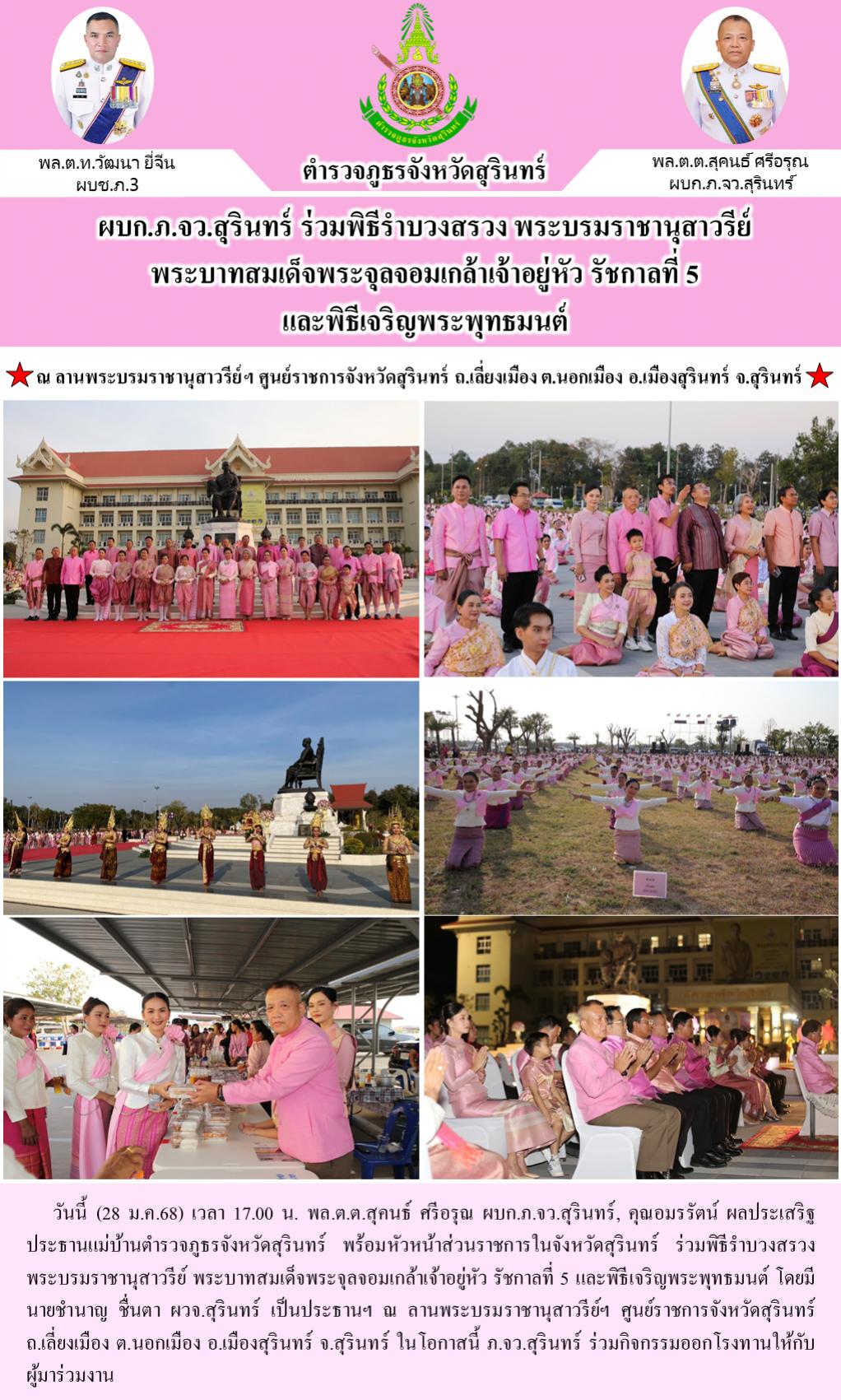 28 ม.ค. 2568 20:54:39ผบก.ภ.จว.สุรินทร์ ร่วมพิธีรำบวงสรวง พระบรมราชานุสาวรีย์ พระบาทสมเด็จพระจุลจอมเกล้าเจ้าอยู่หัว รัชกาลที่ 5 และพิธีเจริญพระพุทธมนต์ วันนี้ (28 ม.ค.68) เวลา 17.00 น. พล.ต.ต.สุคนธ์ ศรีอรุณ ผบก.ภ.จว.สุรินทร์, คุณอมรรัตน์ ผลประเสริฐ ประธานแม่บ้านตำรวจภูธรจังหวัดสุรินทร์ พร้อมหัวหน้าส่วนราชการในจังหวัดส...