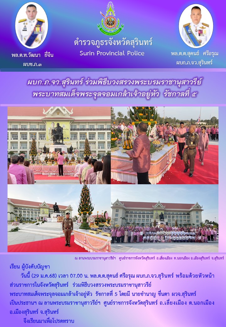 29 ม.ค. 2568 14:12:11 วันนี้ (29 ม.ค.68) เวลา 07.00 น. พล.ต.ต.สุคนธ์ ศรีอรุณ ผบก.ภ.จว.สุรินทร์ พร้อมด้วยหัวหน้าส่วนราชการในจังหวัดสุรินทร์ ร่วมพิธีบวงสรวง พระบรมราชานุสาวรีย์ พระบาทสมเด็จพระจุลจอมเกล้าเจ้าอยู่หัว รัชกาลที่ 5 โดยมี นายชำนาญ ชื่นตา ผวจ.สุรินทร์ เป็นประธานฯ ณ ลานพระบรมราชานุสาวรีย์ฯ ศูนย์ราชการจังหวัดสุริ...