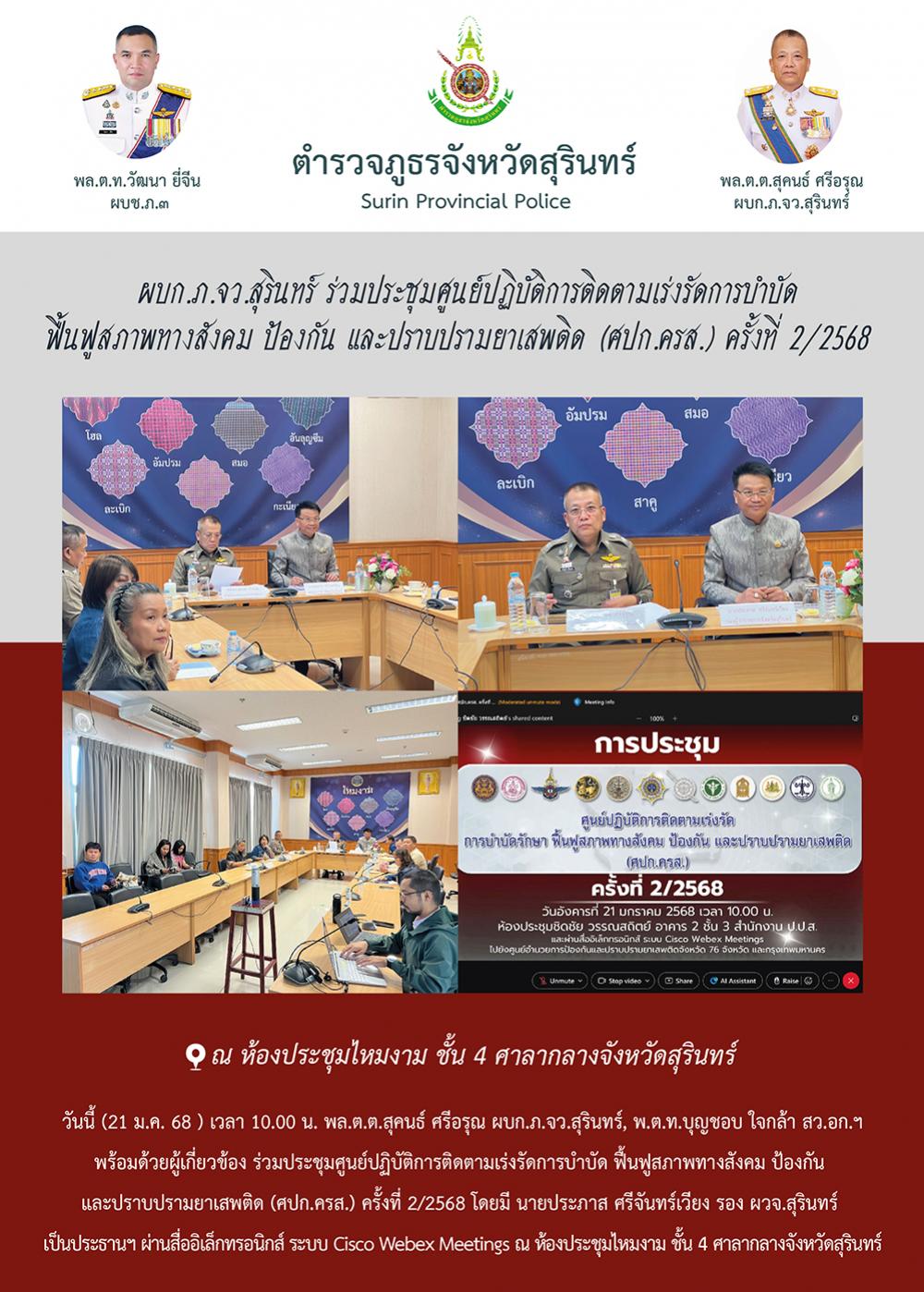 21 ม.ค. 2568 12:58:28 ผบก.ภ.จว.สุรินทร์ ร่วมประชุมศูนย์ปฏิบัติการติดตามเร่งรัดการบำบัด ฟื้นฟูสภาพทางสังคม ป้องกัน และปราบปรามยาเสพติด (ศปก.ครส.) ครั้งที่ 2/2568 วันนี้ (21 ม.ค. 68 ) เวลา 10.00 น. พล.ต.ต.สุคนธ์ ศรีอรุณ ผบก.ภ.จว.สุรินทร์, พ.ต.ท.บุญชอบ ใจกล้า สว.อก.ฯ พร้อมด้วยผู้เกี่ยวข้อง ร่วมประชุมศูนย์ปฏิบัติการติดต...