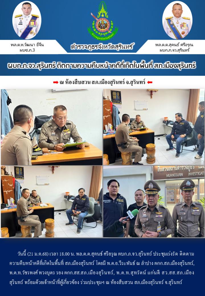 21 ม.ค. 2568 19:25:18ผบก.ภ.จว.สุรินทร์ ติดตามความคืบหน้าคดีที่เกิดในพื้นที่ สภ.เมืองสุรินทร์ วันนี้ (21 ม.ค.68) เวลา 18.00 น. พล.ต.ต.สุคนธ์ ศรีอรุณ ผบก.ภ.จว.สุรินทร์ ประชุมเร่งรัด ติดตามความคืบหน้าคดีที่เกิดในพื้นที่ สภ.เมืองสุรินทร์ โดยมี พ.ต.อ.วีระพันธ์ ณ ลำปาง ผกก.สภ.เมืองสุรินทร์, พ.ต.ท.วัชรพงศ์ พวงบุตร รอง ผกก.สส....