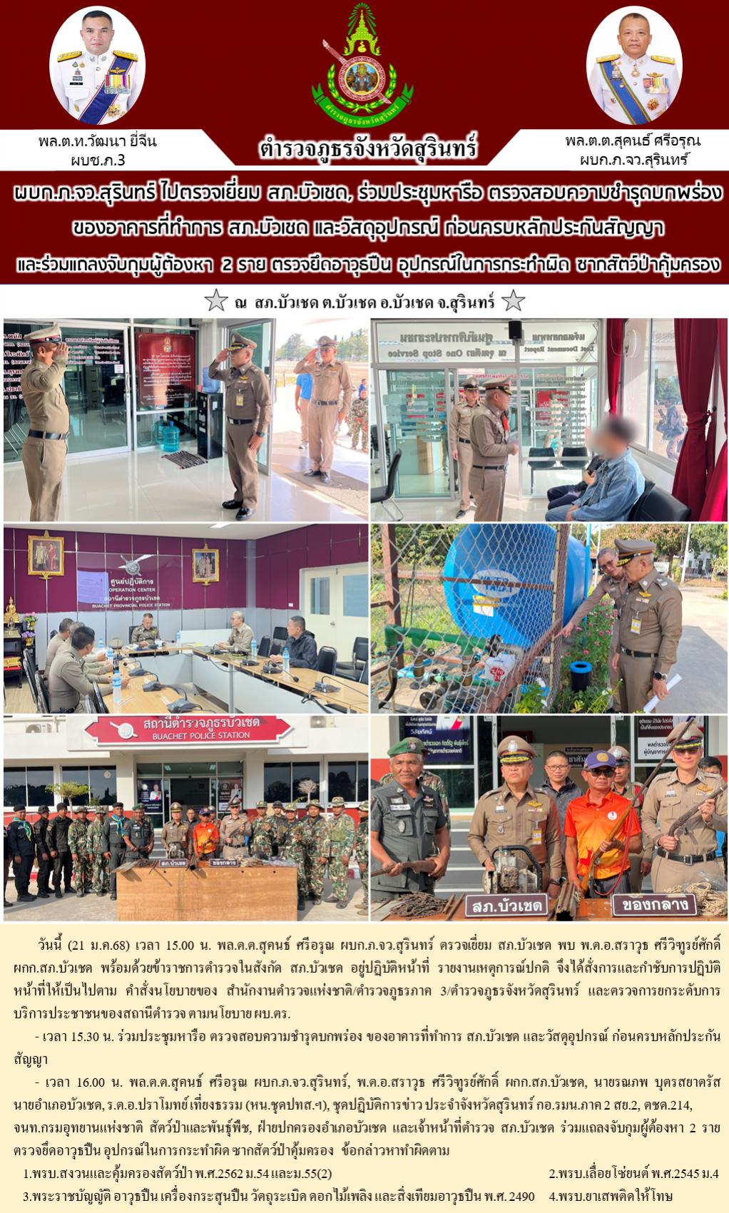 21 ม.ค. 2568 19:25:23ผบก.ภ.จว.สุรินทร์ ไปตรวจเยี่ยม สภ.บัวเชด, ร่วมประชุมหารือ ตรวจสอบความชำรุดบกพร่องของอาคารที่ทำการ สภ.บัวเชด และวัสดุอุปกรณ์ ก่อนครบหลักประกันสัญญา และร่วมแถลงจับกุมผู้ต้องหา 2 ราย ตรวจยึดอาวุธปืน อุปกรณ์ในการกระทำผิด ซากสัตว์ป่าคุ้มครอง วันนี้ (21 ม.ค.68) เวลา 15.00 น. พล.ต.ต.สุคนธ์ ศรีอรุณ ผบก.ภ...