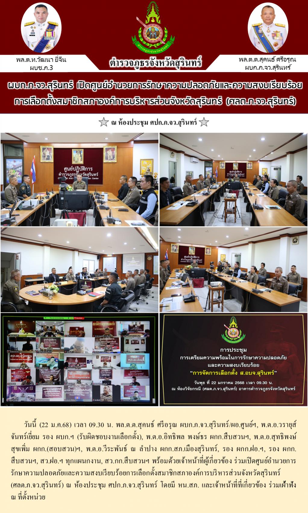 22 ม.ค. 2568 12:43:13ผบก.ภ.จว.สุรินทร์ เปิดศูนย์อำนวยการรักษาความปลอดภัยและความสงบเรียบร้อย การเลือกตั้งสมาชิกสภาองค์การบริหารส่วนจังหวัดสุรินทร์ (ศลต.ภ.จว.สุรินทร์) วันนี้ (22 ม.ค.68) เวลา 09.30 น. พล.ต.ต.สุคนธ์ ศรีอรุณ ผบก.ภ.จว.สุรินทร์/ผอ.ศูนย์ฯ, พ.ต.อ.วรายุส์ จันทร์เยี่ยม รอง ผบก.ฯ (รับผิดชอบงานเลือกตั้ง), พ.ต.อ.อิ...