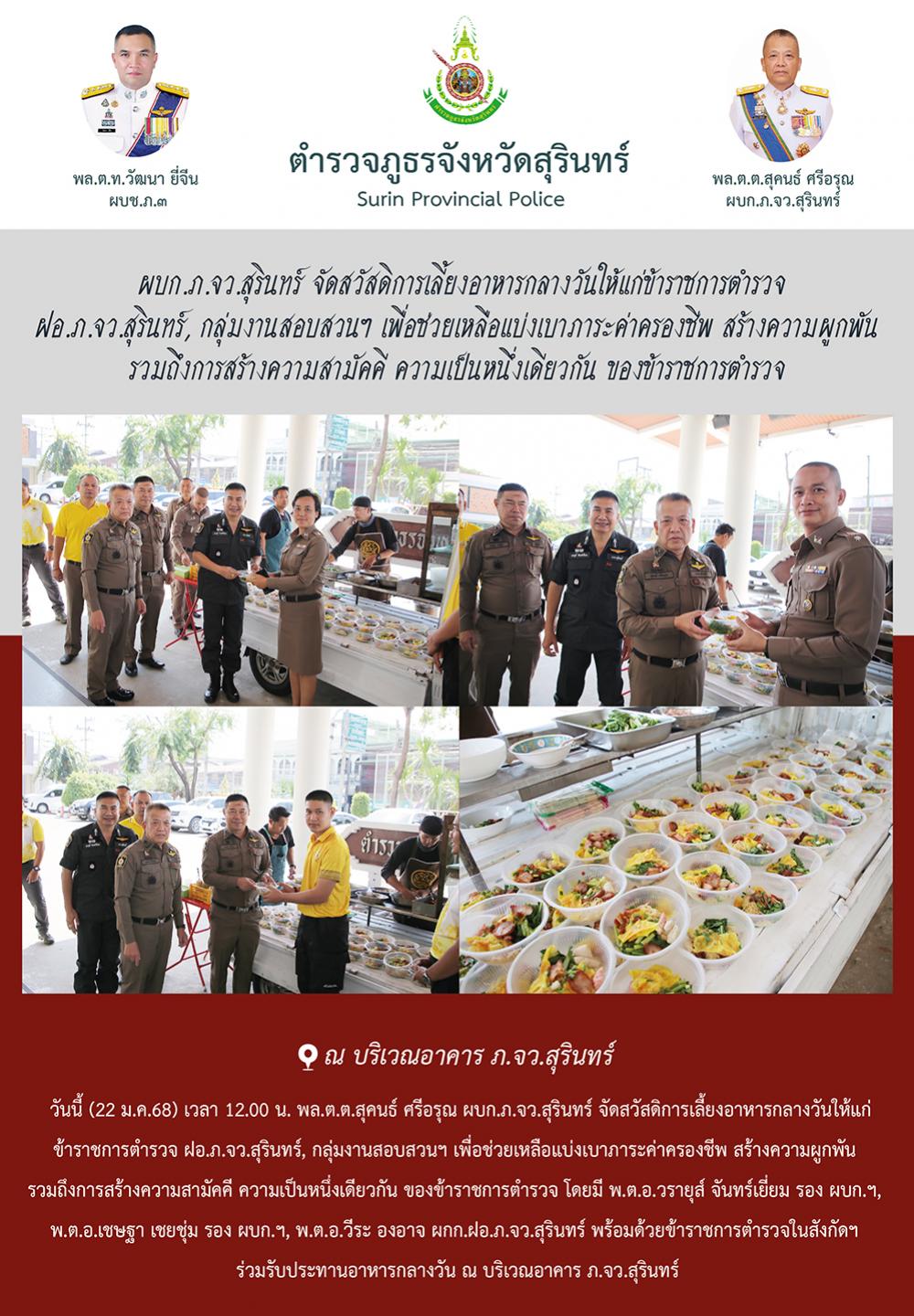 22 ม.ค. 2568 15:45:42 ผบก.ภ.จว.สุรินทร์ จัดสวัสดิการเลี้ยงอาหารกลางวันให้แก่ข้าราชการตำรวจ ฝอ.ภ.จว.สุรินทร์, กลุ่มงานสอบสวนฯ เพื่อช่วยเหลือแบ่งเบาภาระค่าครองชีพ สร้างความผูกพัน รวมถึงการสร้างความสามัคคี ความเป็นหนึ่งเดียวกัน ของข้าราชการตำรวจ วันนี้ (22 ม.ค.68) เวลา 12.00 น. พล.ต.ต.สุคนธ์ ศรีอรุณ ผบก.ภ.จว.สุรินทร์ จัด...