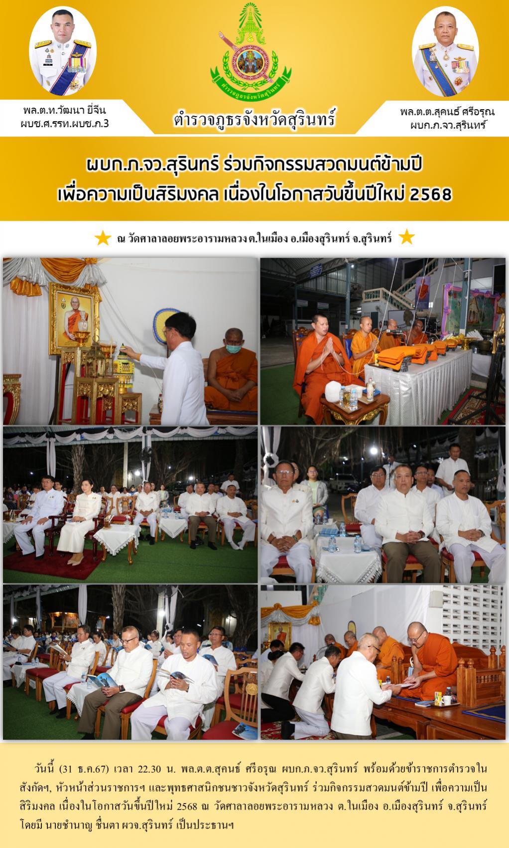 1 ม.ค. 2568 01:09:36ผบก.ภ.จว.สุรินทร์ ร่วมกิจกรรมสวดมนต์ข้ามปี เพื่อความเป็นสิริมงคล เนื่องในโอกาสวันขึ้นปีใหม่ 2568 วันนี้ (31 ธ.ค.67) เวลา 22.30 น. พล.ต.ต.สุคนธ์ ศรีอรุณ ผบก.ภ.จว.สุรินทร์ พร้อมด้วยข้าราชการตำรวจในสังกัดฯ, หัวหน้าส่วนราชการฯ และพุทธศาสนิกชนชาวจังหวัดสุรินทร์ ร่วมกิจกรรมสวดมนต์ข้ามปี เพื่อความเป็นสิร...