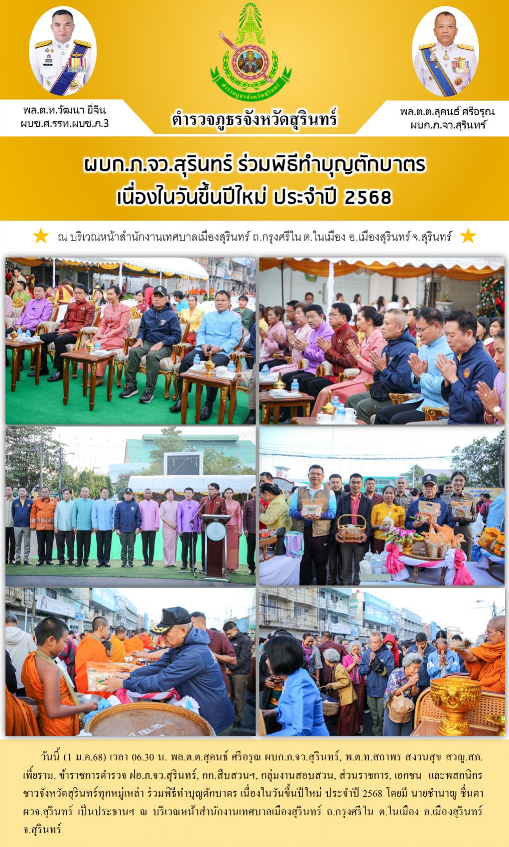 1 ม.ค. 2568 08:51:37 ผบก.ภ.จว.สุรินทร์ ร่วมพิธีทำบุญตักบาตร เนื่องในวันขึ้นปีใหม่ ประจำปี 2568 วันนี้ (1 ม.ค.68) เวลา 06.30 น. พล.ต.ต.สุคนธ์ ศรีอรุณ ผบก.ภ.จว.สุรินทร์, พ.ต.ท.สถาพร สงวนสุข สวญ.สภ.เพี้ยราม, ข้าราชการตำรวจ ฝอ.ภ.จว.สุรินทร์, กก.สืบสวนฯ, กลุ่มงานสอบสวน, ส่วนราชการ, เอกชน และพสกนิกรชาวจังหวัดสุรินทร...