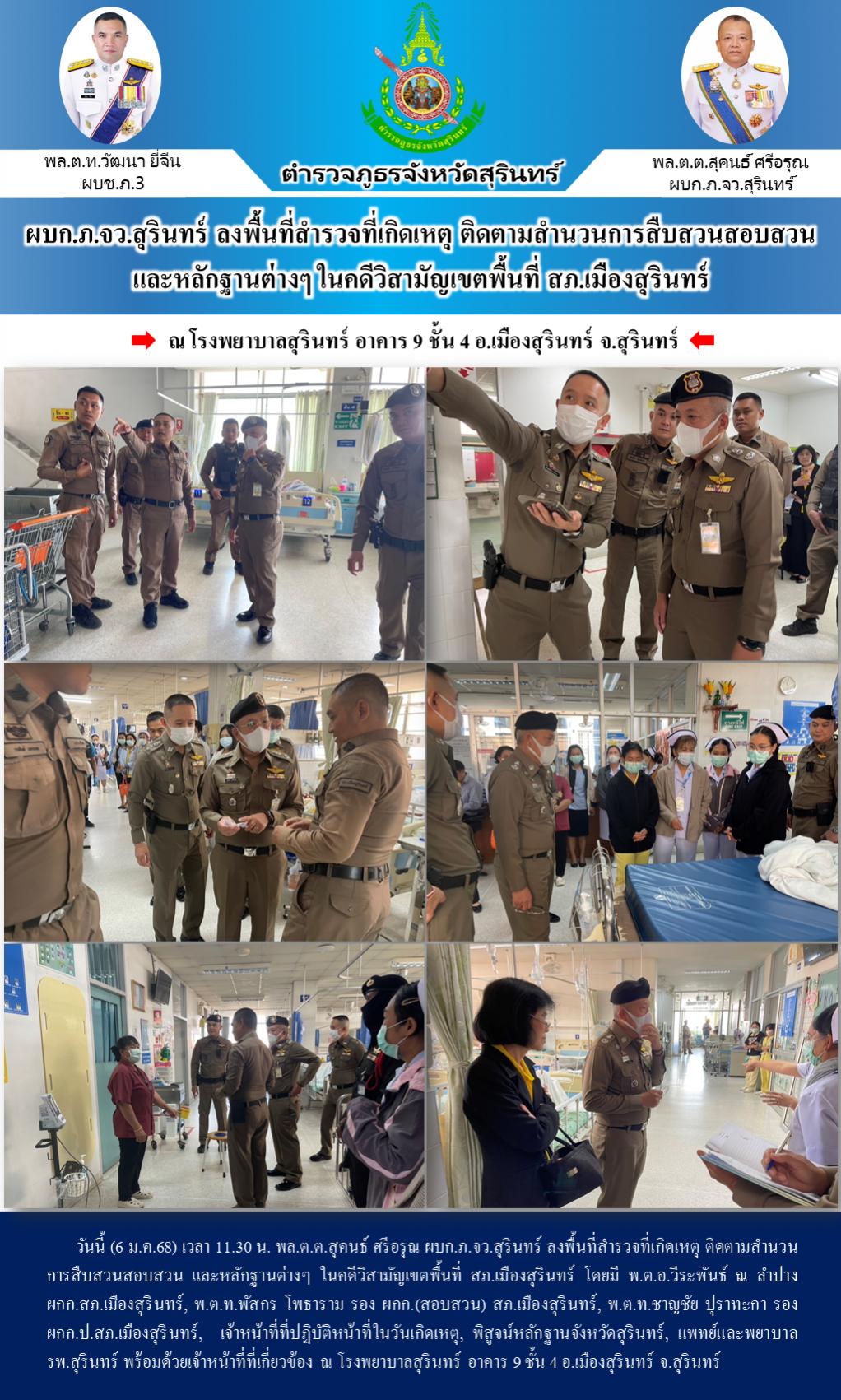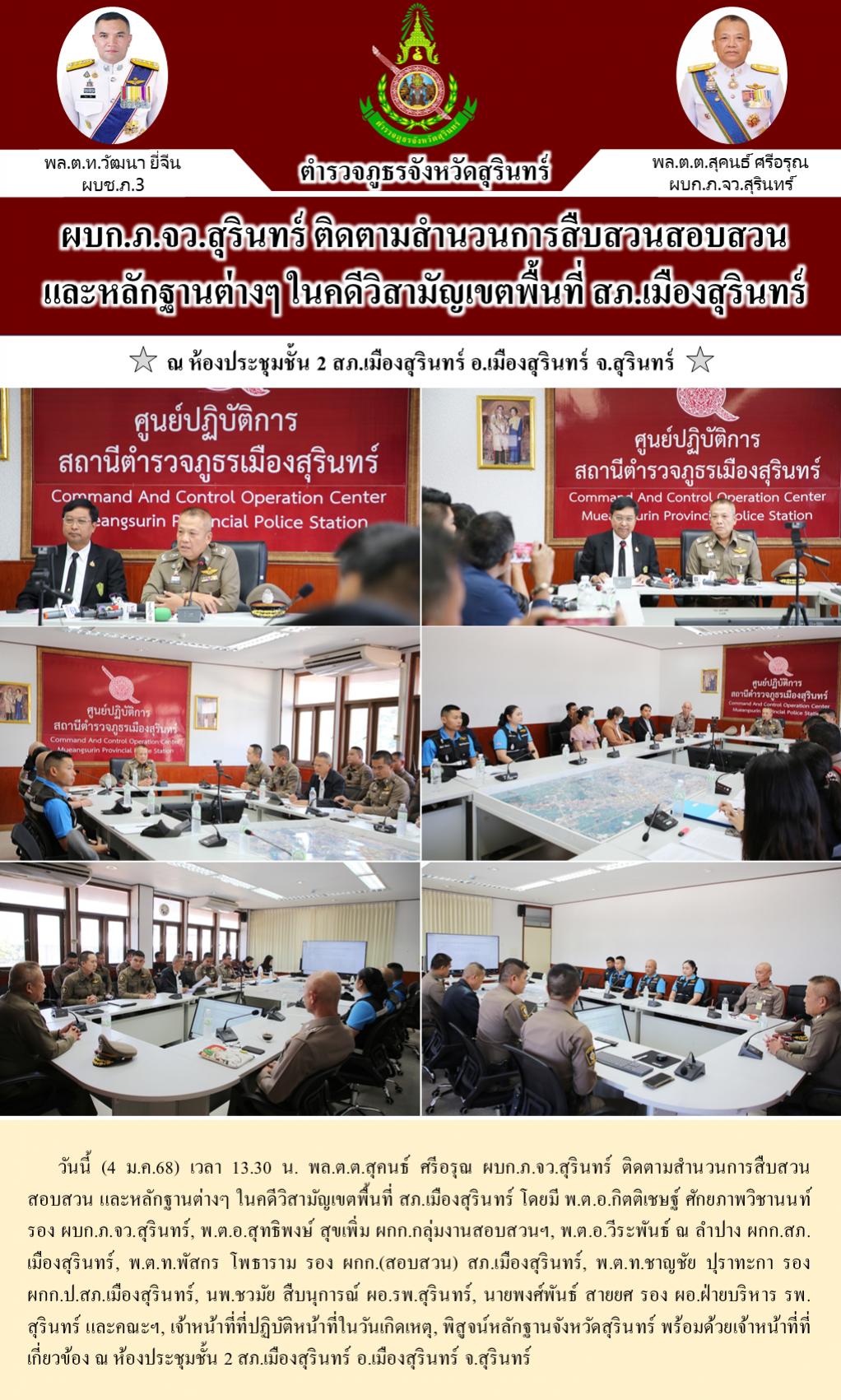4 ม.ค. 2568 18:38:00ผบก.ภ.จว.สุรินทร์ ติดตามสำนวนการสืบสวนสอบสวน และหลักฐานต่างๆ ในคดีวิสามัญเขตพื้นที่ สภ.เมืองสุรินทร์ วันนี้ (4 ม.ค.68) เวลา 13.30 น. พล.ต.ต.สุคนธ์ ศรีอรุณ ผบก.ภ.จว.สุรินทร์ ติดตามสำนวนการสืบสวนสอบสวน และหลักฐานต่างๆ ในคดีวิสามัญเขตพื้นที่ สภ.เมืองสุรินทร์ โดยมี พ.ต.อ.กิตติเชษฐ์ ศักยภาพวิชานนท์ รอ...
