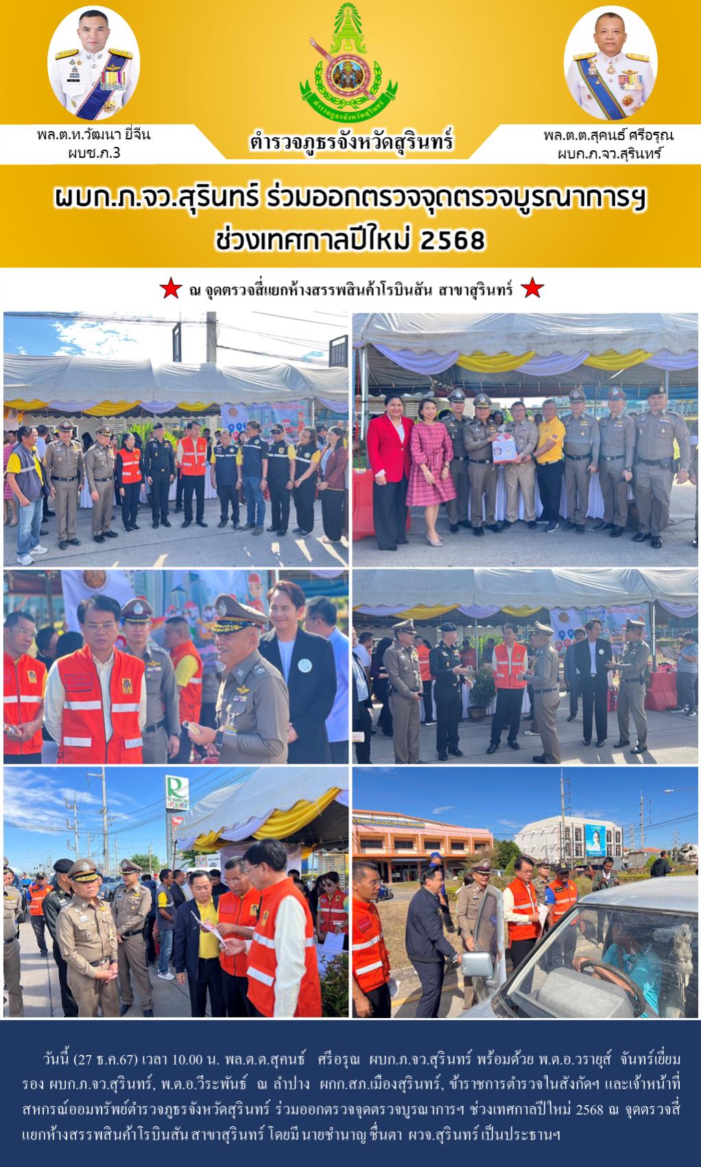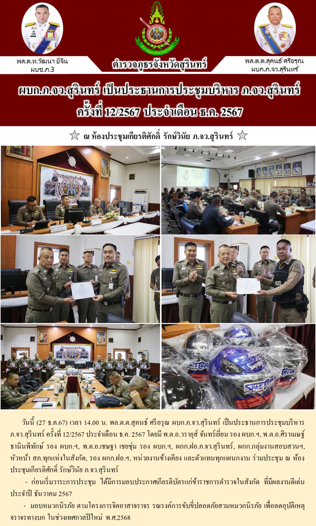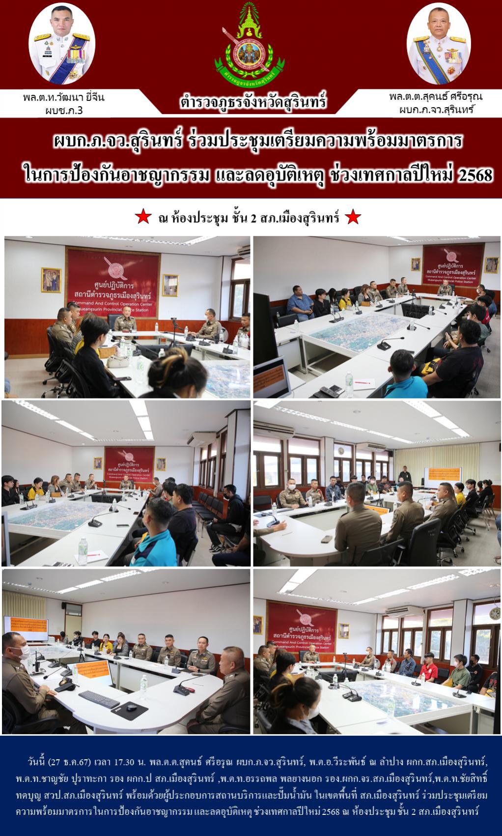 27 ธ.ค. 2567 19:58:17ผบก.ภ.จว.สุรินทร์ ร่วมประชุมเตรียมความพร้อมมาตรการในการป้องกันอาชญากรรม และลดอุบัติเหตุ ช่วงเทศกาลปีใหม่ 2568 วันนี้ (27 ธ.ค.67) เวลา 17.30 น. พล.ต.ต.สุคนธ์ ศรีอรุณ ผบก.ภ.จว.สุรินทร์, พ.ต.อ.วีระพันธ์ ณ ลำปาง ผกก.สภ.เมืองสุรินทร์, พ.ต.ท.ชาญชัย ปุราทะกา รอง ผกก.ป สภ.เมืองสุรินทร์ ,พ.ต.ท.อรรถพล พลยางน...