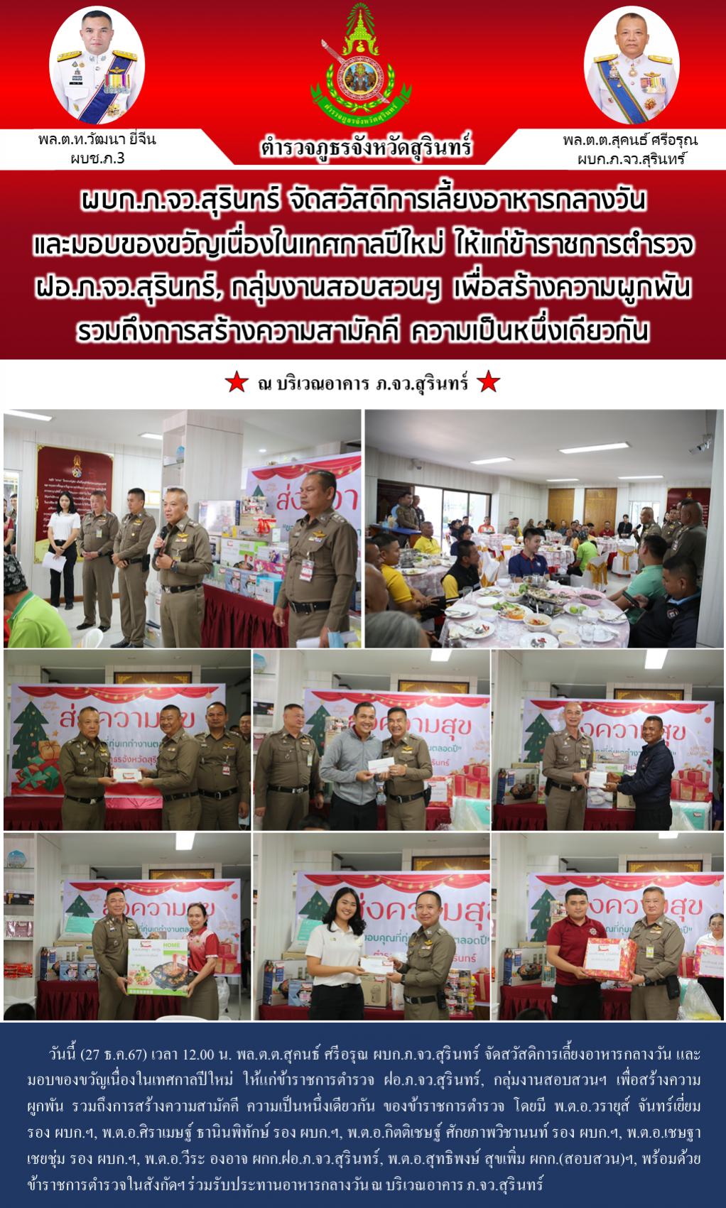 27 ธ.ค. 2567 17:55:37ผบก.ภ.จว.สุรินทร์ ร่วมออกตรวจจุดตรวจบูรณาการฯ ช่วงเทศกาลปีใหม่ 2568 วันนี้ (27 ธ.ค.67) เวลา 12.00 น. พล.ต.ต.สุคนธ์ ศรีอรุณ ผบก.ภ.จว.สุรินทร์ จัดสวัสดิการเลี้ยงอาหารกลางวัน และมอบของขวัญเนื่องในเทศกาลปีใหม่ ให้แก่ข้าราชการตำรวจ ฝอ.ภ.จว.สุรินทร์, กลุ่มงานสอบสวนฯ เพื่อสร้างความผูกพัน รวมถึงการสร้างคว...