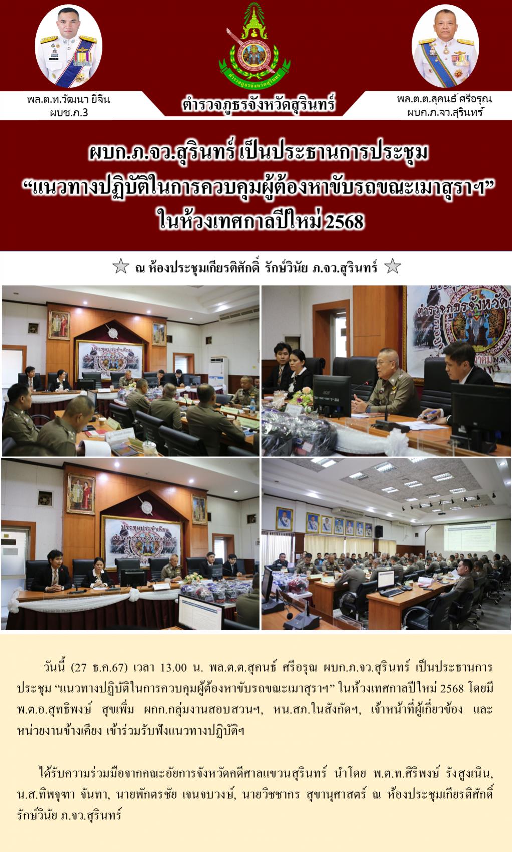 27 ธ.ค. 2567 17:55:52ผบก.ภ.จว.สุรินทร์ เป็นประธานการประชุม “แนวทางปฏิบัติในการควบคุมผู้ต้องหาขับรถขณะเมาสุราฯ” ในห้วงเทศกาลปีใหม่ 2568 วันนี้ (27 ธ.ค.67) เวลา 13.00 น. พล.ต.ต.สุคนธ์ ศรีอรุณ ผบก.ภ.จว.สุรินทร์ เป็นประธานการประชุม “แนวทางปฏิบัติในการควบคุมผู้ต้องหาขับรถขณะเมาสุราฯ” ในห้วงเทศกาลปีใหม่ 2568 โดยมี พ.ต.อ.สุ...