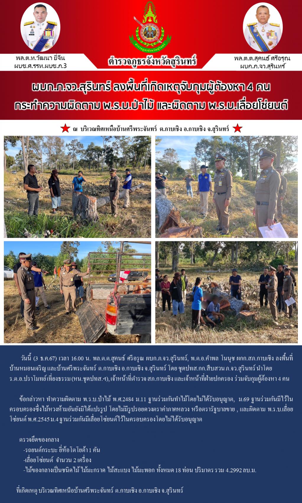 3 ธ.ค. 2567 22:28:12ผบก.ภ.จว.สุรินทร์ ลงพื้นที่เกิดเหตุจับกุมผู้ต้องหา 4 คน กระทำความผิดตาม พ.ร.บ.ป่าไม้ และผิดตาม พ.ร.บ.เลื่อยโซ่ยนต์ วันนี้ (3 ธ.ค.67) เวลา 16.00 น. พล.ต.ต.สุคนธ์ ศรีอรุณ ผบก.ภ.จว.สุรินทร์, พ.ต.อ.คำพล โนนุช ผกก.สภ.กาบเชิง ลงพื้นที่บ้านหมอนเจริญ และบ้านศรีพระจันทร์ ต.กาบเชิง อ.กาบเชิง จ.สุริน...