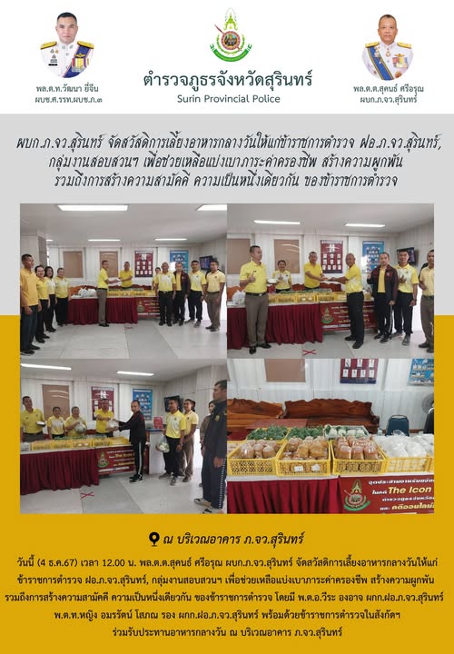 4 ธ.ค. 2567 14:39:11 ผบก.ภ.จว.สุรินทร์ จัดสวัสดิการเลี้ยงอาหารกลางวันให้แก่ข้าราชการตำรวจ ฝอ.ภ.จว.สุรินทร์, กลุ่มงานสอบสวนฯ เพื่อช่วยเหลือแบ่งเบาภาระค่าครองชีพ สร้างความผูกพัน รวมถึงการสร้างความสามัคคี ความเป็นหนึ่งเดียวกัน ของข้าราชการตำรวจ วันนี้ (4 ธ.ค.67) เวลา 12.00 น. พล.ต.ต.สุคนธ์ ศรีอรุณ ผบก.ภ.จว.สุรินทร์ จัดสว...